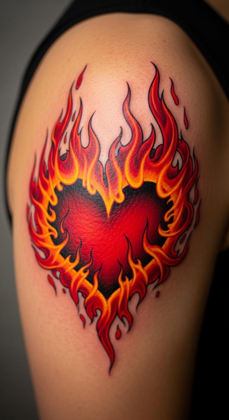 Flaming hearts bring heat and intensity. Symbolize burning emotions. Fun and fiery. Use colored markers to plan. Websites have free flames. Budget sessions cost $80. Temporary kits mimic the fire. Add licks of flame for pop. Shoulder placement works great. Lotion helps longevity. Straightforward for anyone.