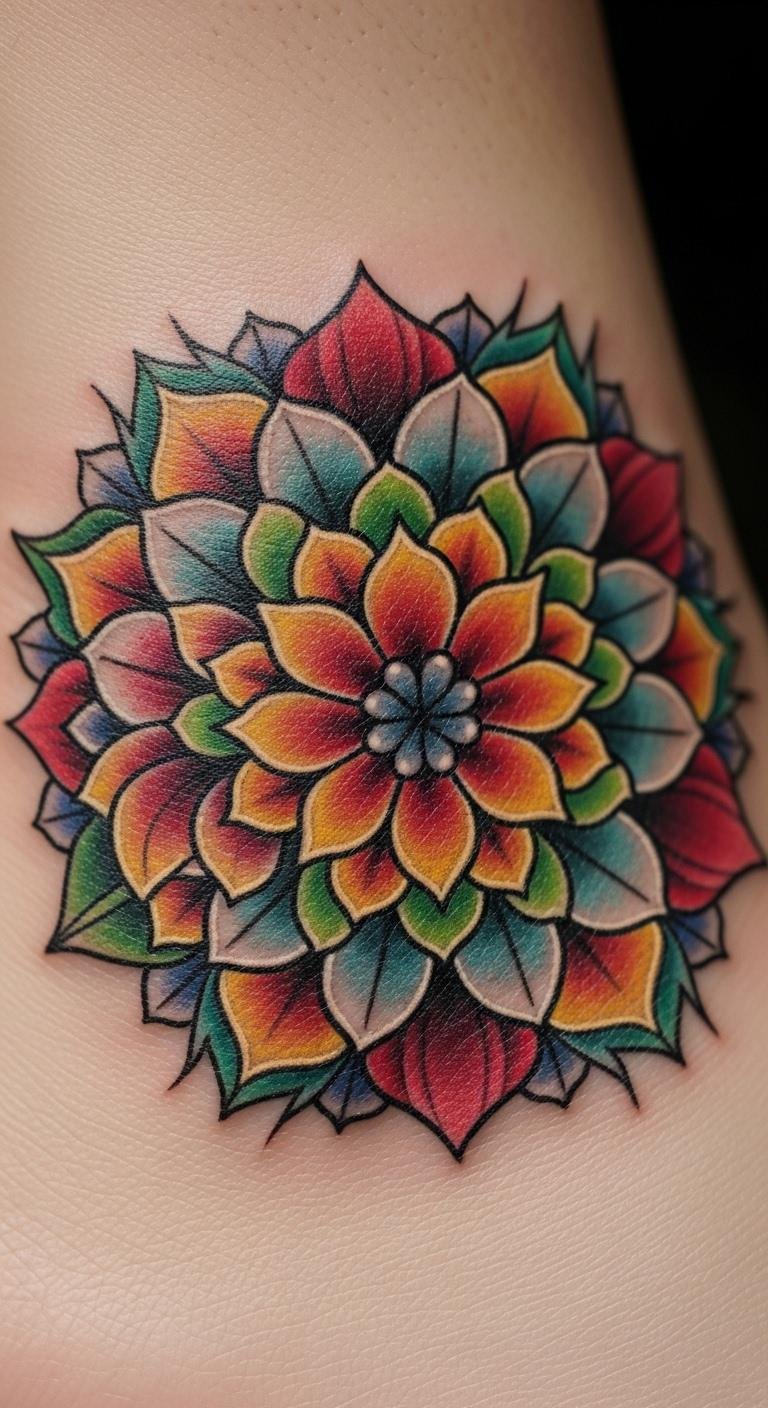 Colorful mandalas use bold hues for energy. Begin with colored pencils on paper to plan your palette. This style shines on thighs for larger space. Budget idea: Test with washable markers from your kid’s set. Layer colors carefully for depth. Healing works best with sun protection, using cheap sunscreen. Real DIY: Mix paints at home to match ideas. Bold key: vibrant colors make statements. Opt for sales at local shops to cut costs. It’s fun and expressive for any mood.