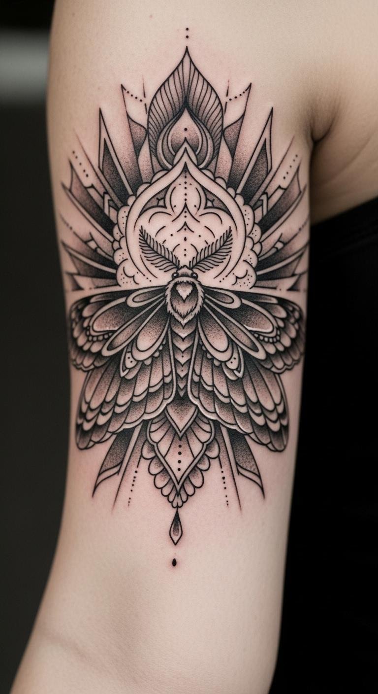 Moth mandalas symbolize change and intuition. Draw wings around a core circle to capture that essence. Use old magazines for free inspiration clippings. This design pops on your upper arm for visibility. Budget hack: Create a stencil from cardboard at home. Add personal symbols like stars with basic supplies. Healing tips: Keep it moist with affordable lotion. Real example: Trace a moth from a book and adapt it. Bold this: moth patterns represent transformation simply. Go for medium size to save money. It’s a meaningful choice that evolves with you.