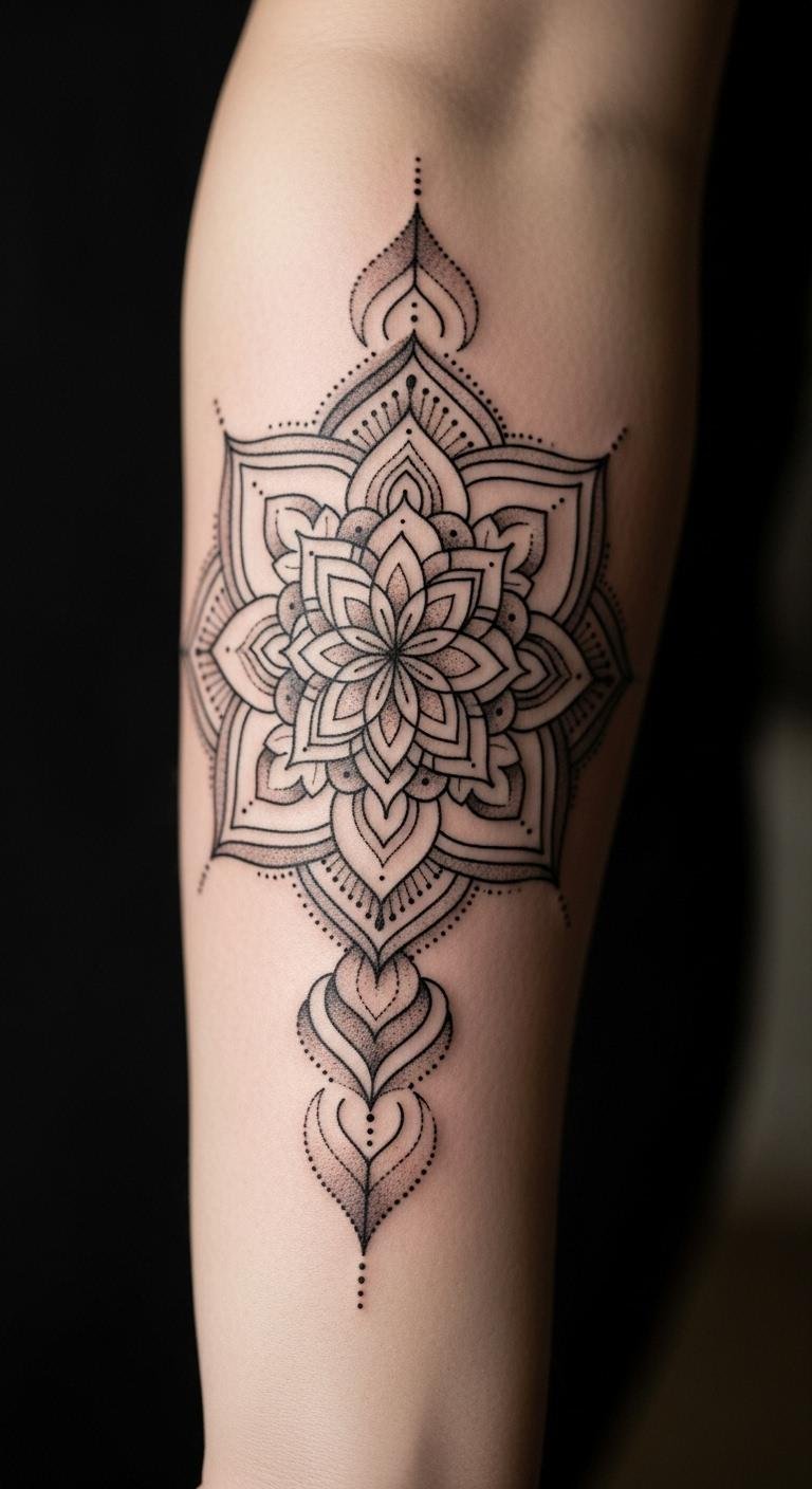 Forearm mandalas balance visibility and cover. Plan with a string outline on your arm. This spot shows off designs daily. Budget tip: Trace templates from free apps. Add elements like lines for personalization. Healing needs air, so use loose sleeves. Real example: Wrap a band around your arm to preview. Bold this: forearm spots offer easy access. Go small to save on sessions. It’s practical for everyday wear.