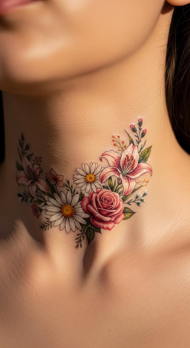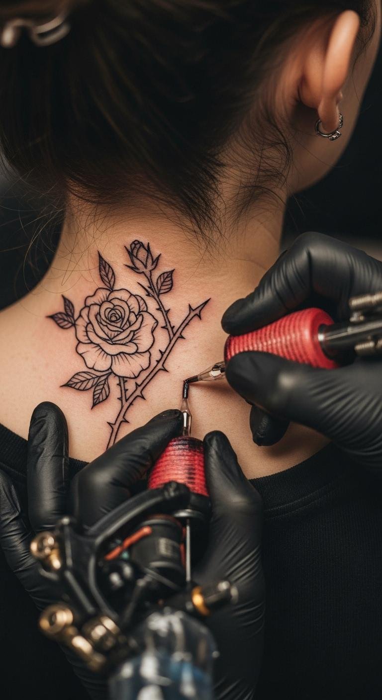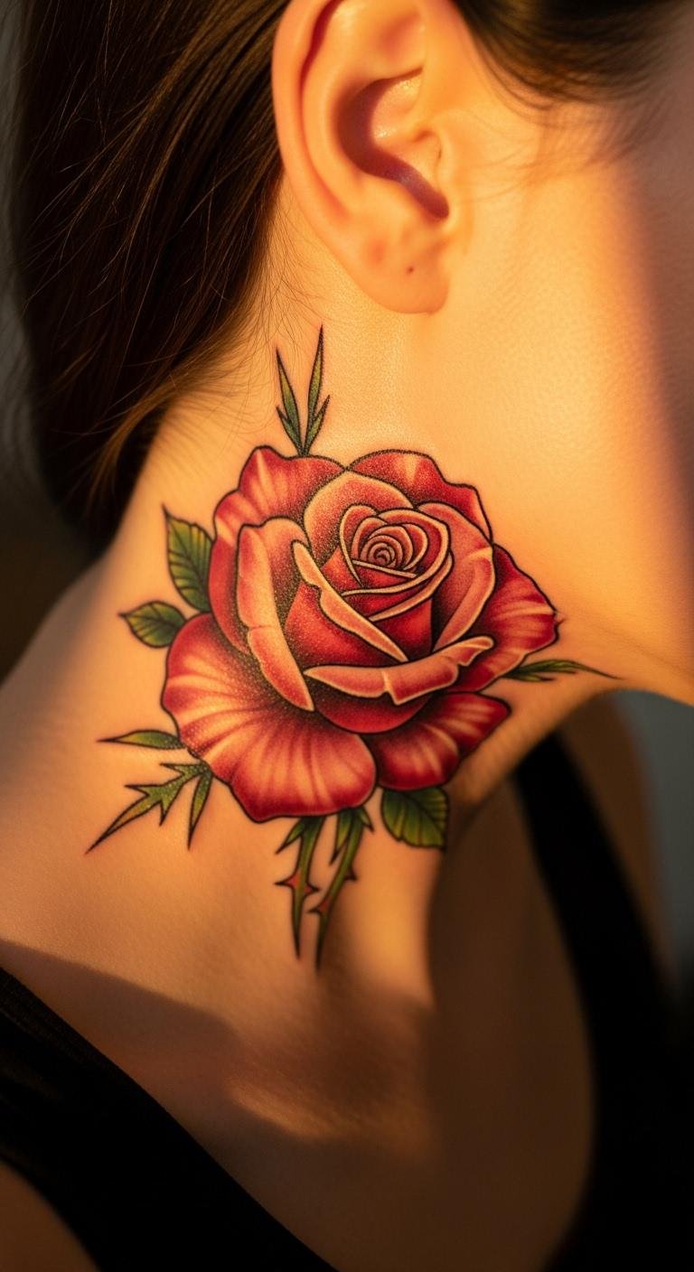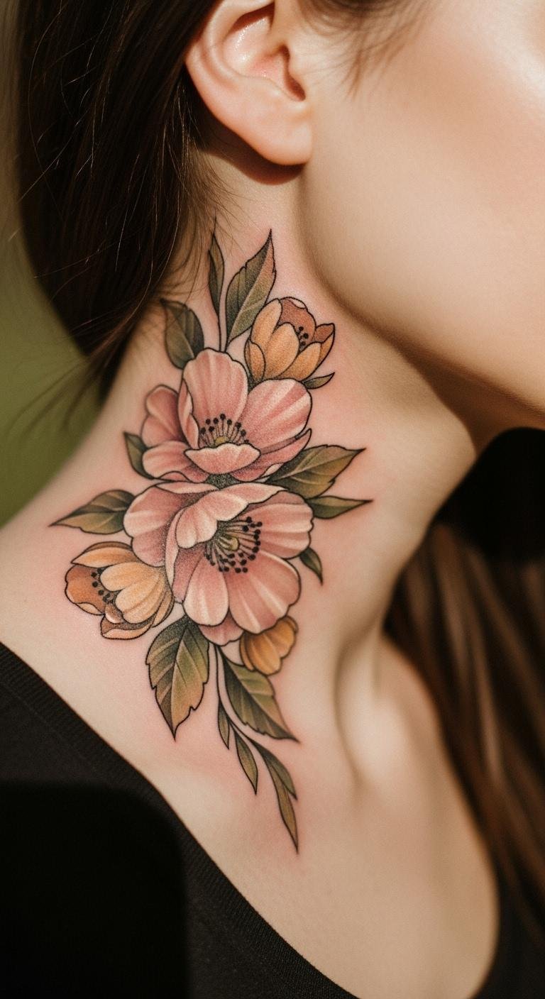 Floral tattoos bring a fresh vibe to your neck. Roses or blossoms look feminine and strong. They symbolize growth or beauty. Sketch a simple flower at home for free. Use washable markers to preview it. Buy floral temporary tattoos online for $10 or less. Stick one on and see how it feels. Opt for the back of the neck to keep it discreet. Artists might charge $60 for a small design. Apply aloe vera from your kitchen for healing. It soothes the skin naturally. This tattoo lets your style shine every day.