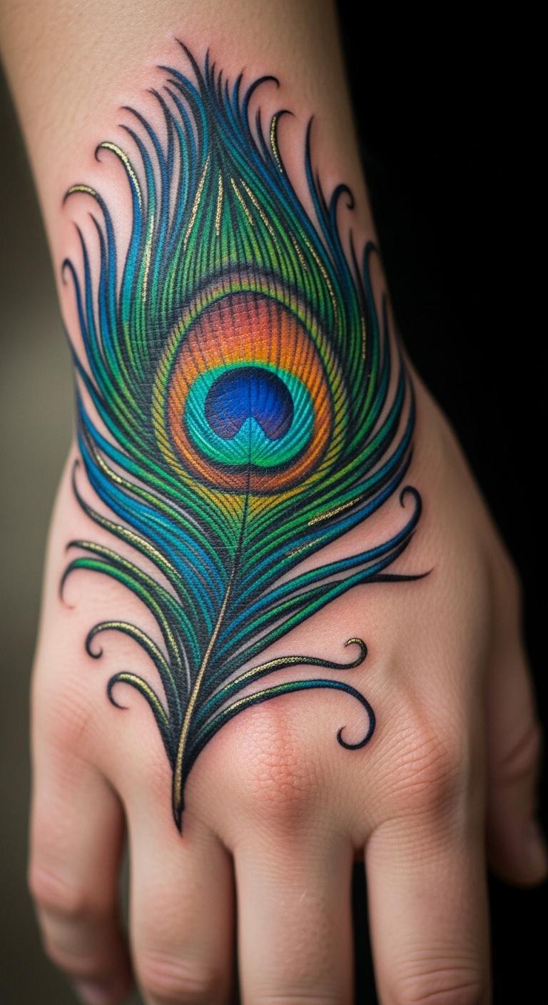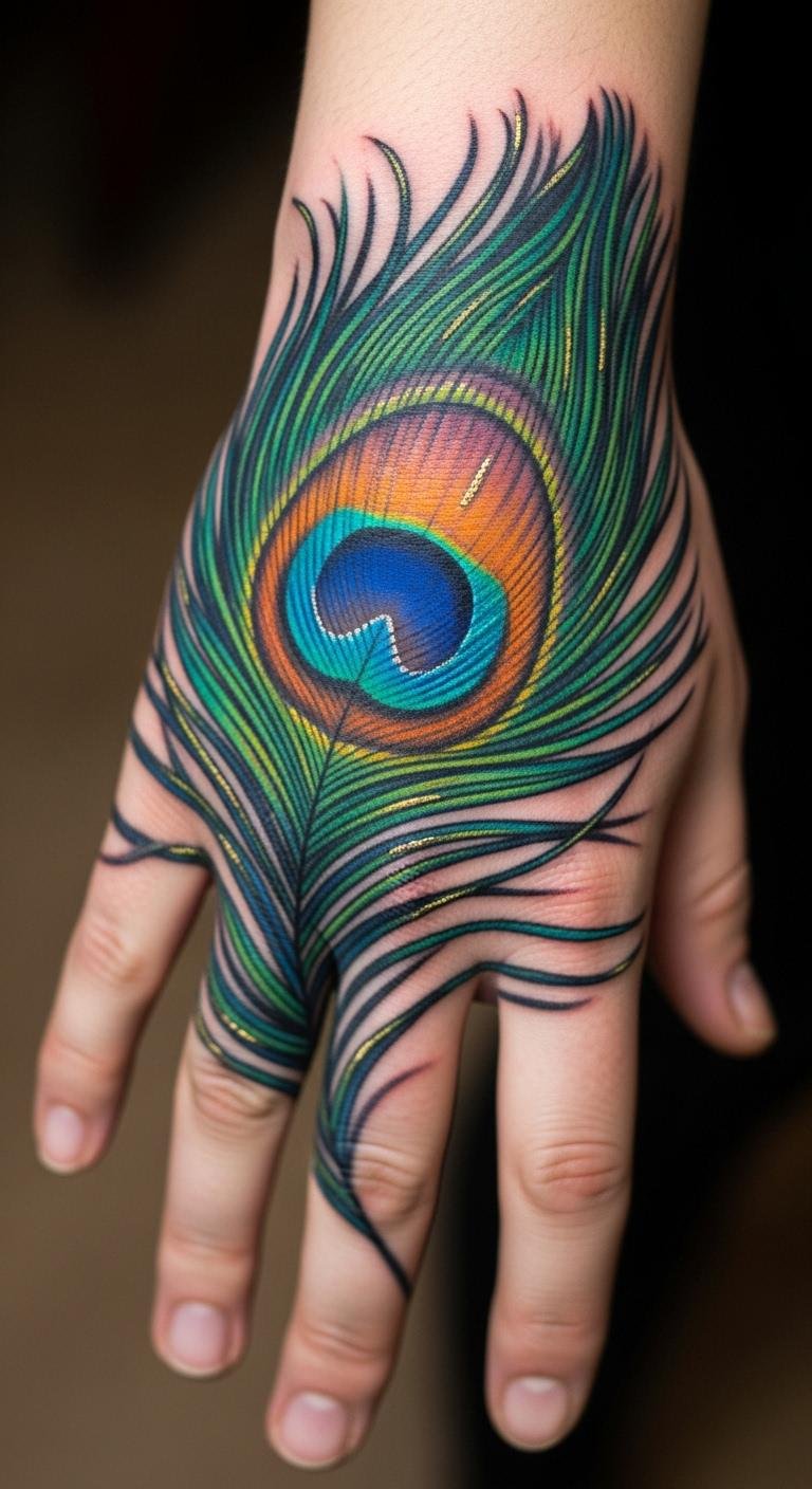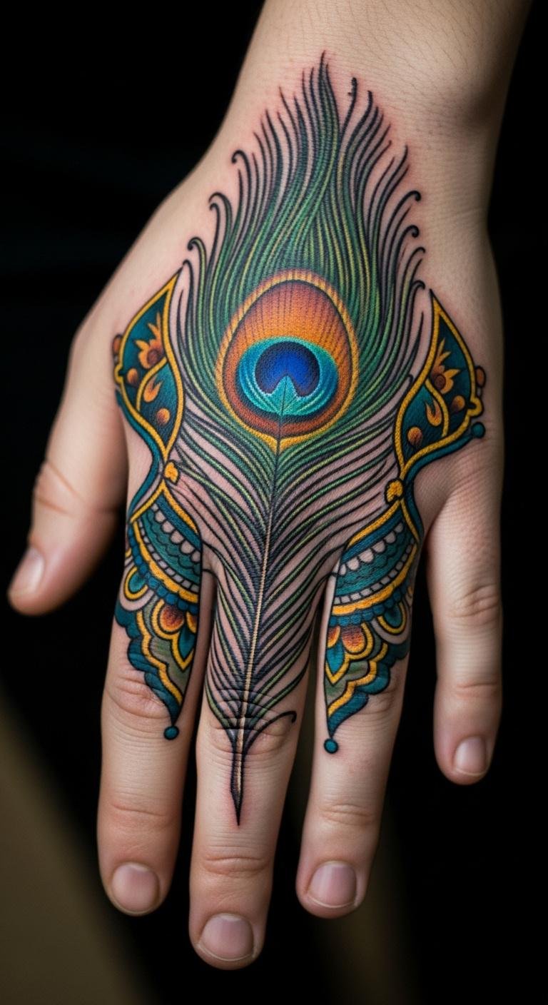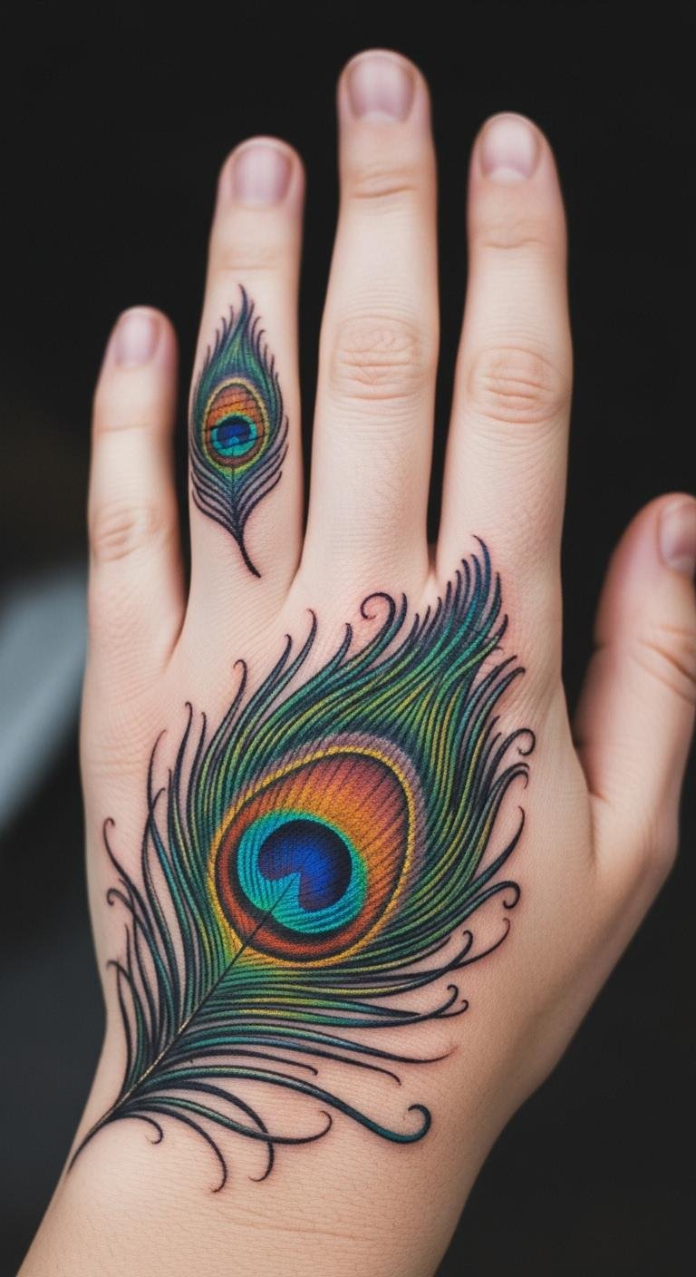 Full-color peacock feathers bring designs to life. Greens and blues make it stand out on your hand. Experiment with colored pencils at home for ideas. This saves money on professional tweaks. Mix in gold shades for a personal touch. Keep it budget-friendly by starting small. A hand tattoo with colors lasts with basic care. Try DIY stencils from paper. Focus on areas that get less wear. Simple steps like this make the process fun.