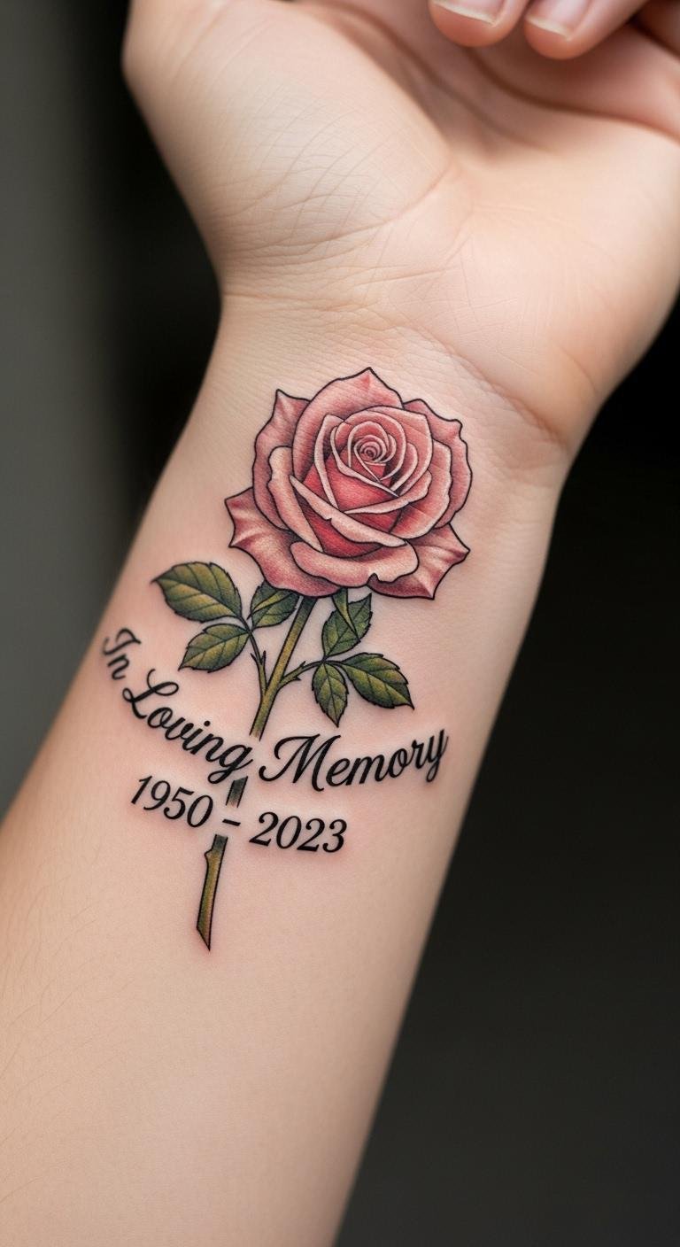 Memorial roses with dates honor loved ones on your wrist. Add numbers for a tribute. Write it on paper first. Costs: $90 to $210. Keep dates minimal to save. Use free fonts for accuracy. Protect with sunscreen daily.