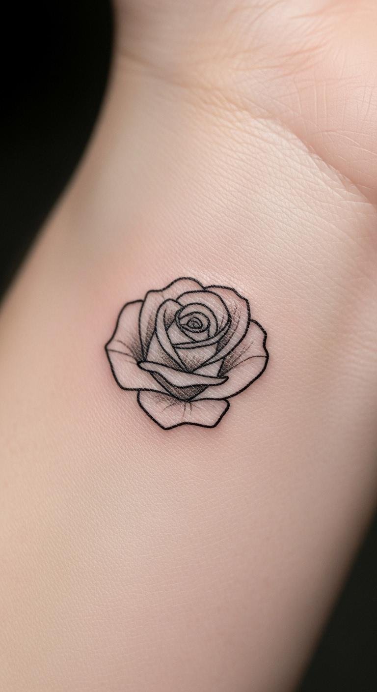 A small dainty rose outline suits a discreet wrist spot. It’s all about clean lines and subtle charm. Test it by drawing on your skin with a marker. Prices start at $40 to $120. Choose thin lines for a budget-friendly option. Personalize with a slight curve using basic drawing tools. Keep it moist with a store-bought balm. This style works for busy days and heals quickly. Easy to get and maintain, it’s a smart choice.