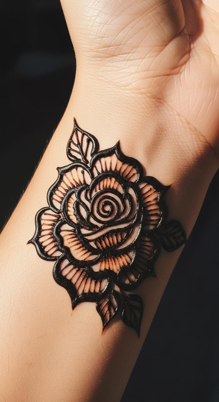 Henna roses let you try a wrist design without commitment. Apply at home with kits. Costs under $10. Draw your own pattern. Wash off when ready.