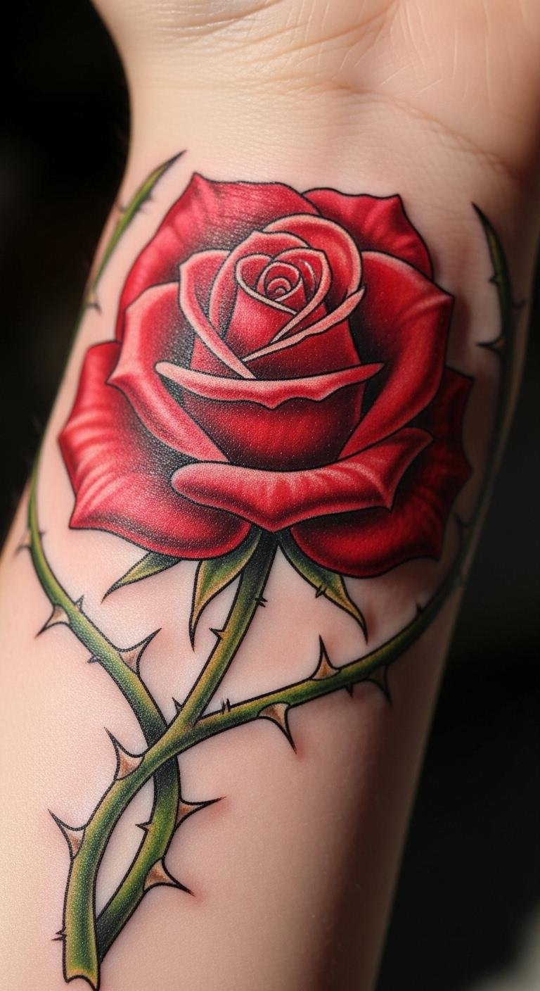 A red rose with thorns adds edge to your wrist, symbolizing strength and passion. The bold color pops against your skin, with thorns for a resilient vibe. Draw a rough version on your arm with a washable pen first. Prices range from $80 to $180, depending on size. Go for red ink that’s easy on the budget. Customize by adding a tiny stem twist, using free design apps. Post-tattoo, protect it from sun with a cheap sleeve. This design fits quick sessions and stays meaningful. Keep it straightforward for lasting appeal.