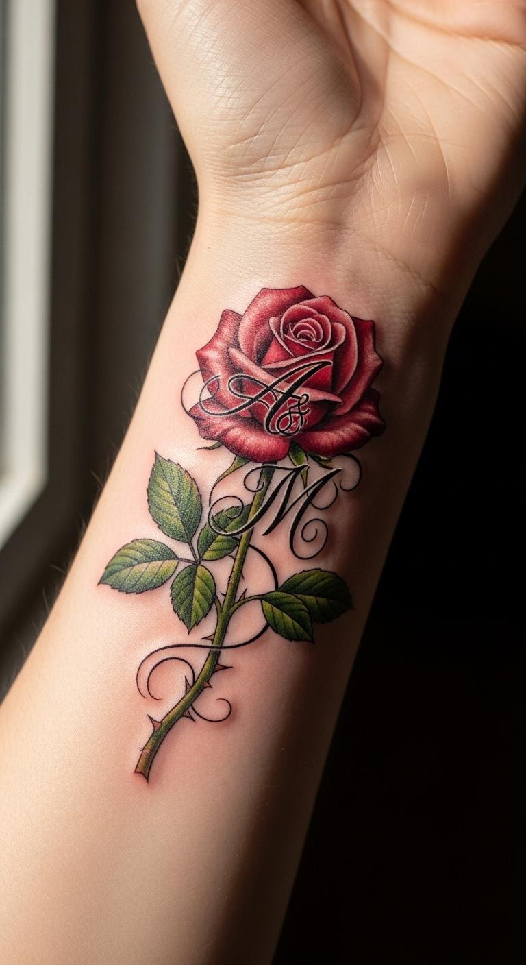 Add initials to a rose for a personal touch on your wrist. This combines the flower with letters, like a monogram of love. Sketch it out with a pencil on paper to fit just right. Expect to spend $70 to $160. Use simple fonts from free sites for ideas. Tweak by placing the initials inside the petals. Heal it with everyday lotion from your cabinet. It’s an affordable way to honor someone special. Quick and meaningful, this design fits any routine.