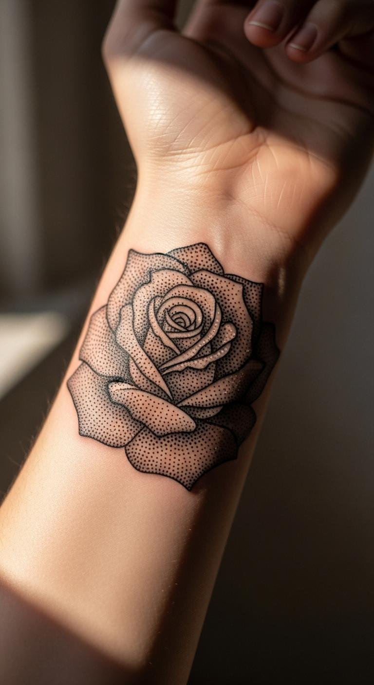 Dotwork roses use tiny dots to build a textured flower on your wrist. It’s modern and unique, with a pointillism feel. Try dotting paper with a pen to see it. Budget? $90 to $200. Go for sparse dots to cut costs. Customize by adding extra patterns from online resources. Protect with sunscreen you own. This method is forgiving and fun. Ideal for a fresh look that lasts.