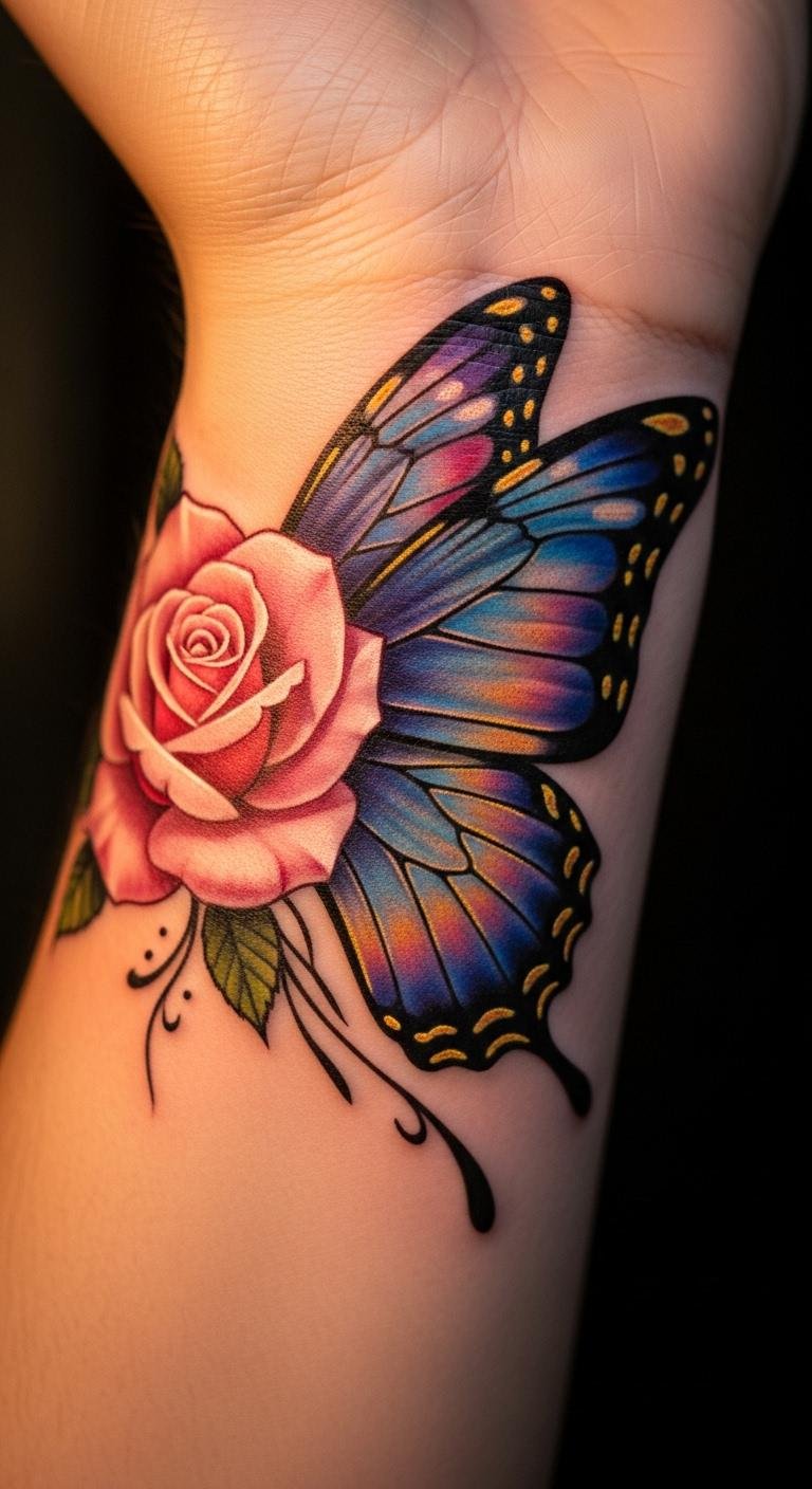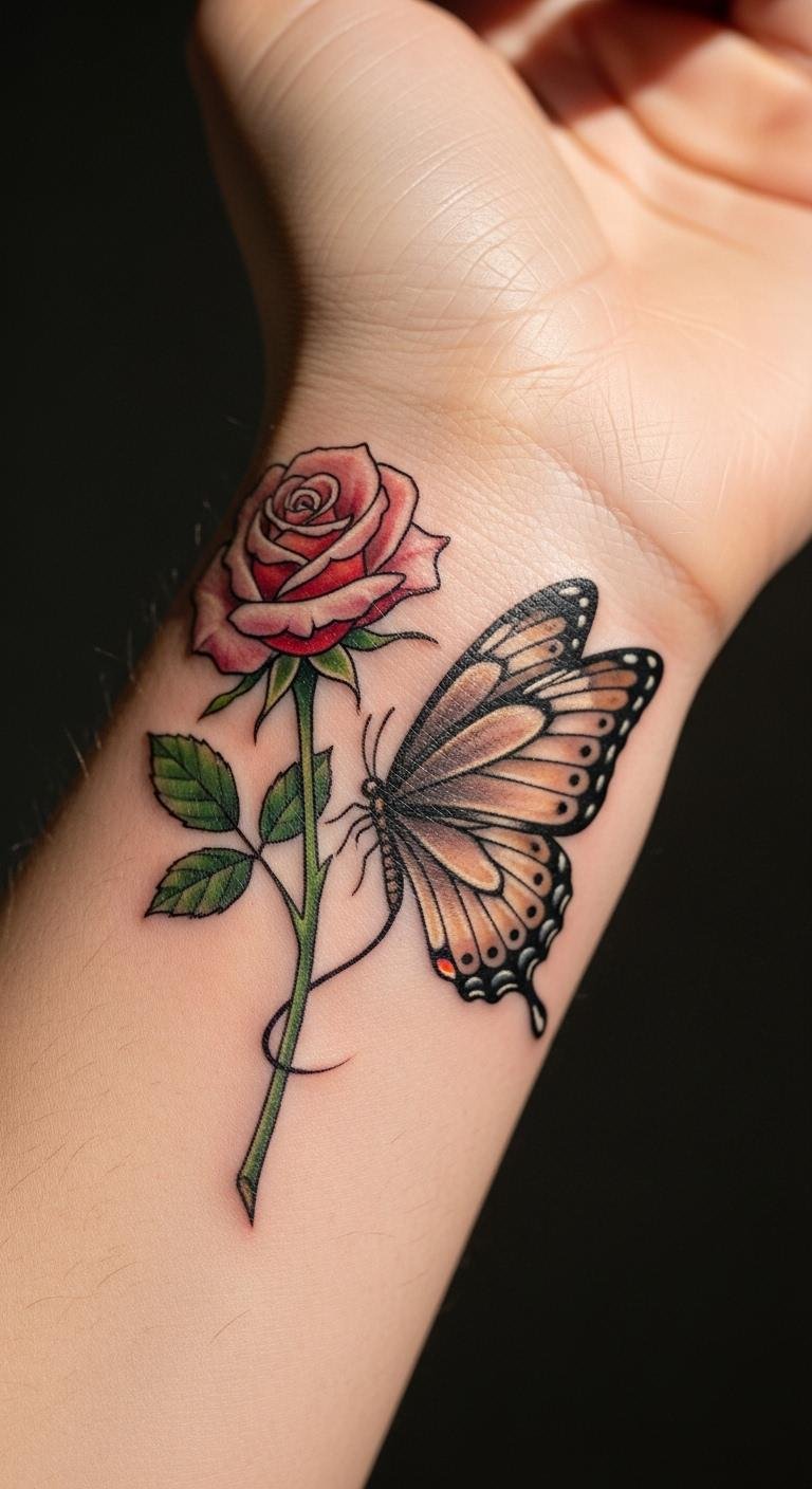 Pair a rose with a butterfly for a whimsical wrist design. The butterfly adds movement to the flower. Sketch both on paper to blend them. Prices? $100 to $220. Use free clipart for inspiration. Make it your own by adjusting the wings. Heal with simple bandages from home. This combo tells a story without breaking the bank.