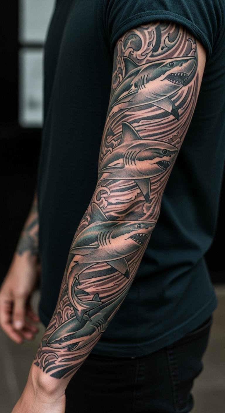 Shark Tattoos in Sleeve Compositions