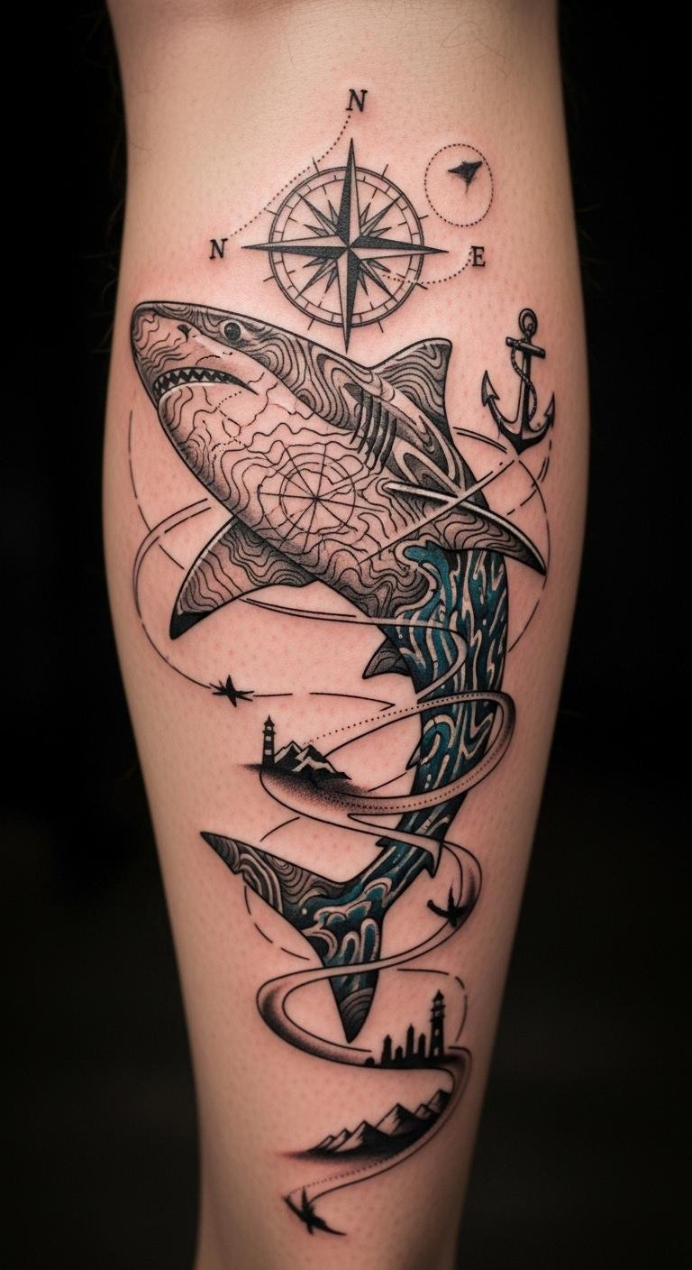 Shark tattoos for journeys mark growth. They symbolize paths taken. See a shark on a travel route. This reflects experiences. Plan with life notes. Sketch journey maps. Place on moving spots. These tattoos inspire. Keep it narrative. Make it your story.