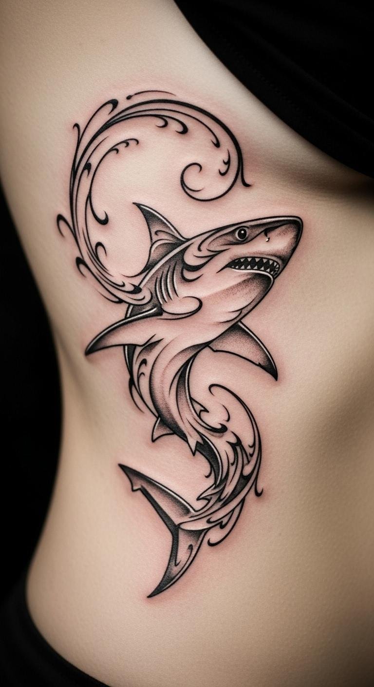 Abstract shark tattoos play with shapes for artistic fun. They turn sharks into flowing designs. Envision abstract waves forming a shark on your side. This look sparks creativity. Use free drawing apps to experiment. Try paper and colors for home ideas. Place it on curved spots for better flow. These tattoos let imagination run wild. Mix in personal symbols. Keep costs low with digital tools. Make it a unique expression.