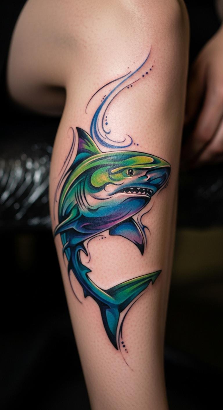Colorful shark tattoos add vibrancy with hues. They use blues and reds for pop. See a rainbow shark on your arm. This look stands out. Mix colors with free apps. Draw with colored pencils at home. Place it for maximum color show. These designs energize. Experiment simply. Make it fun and bright.