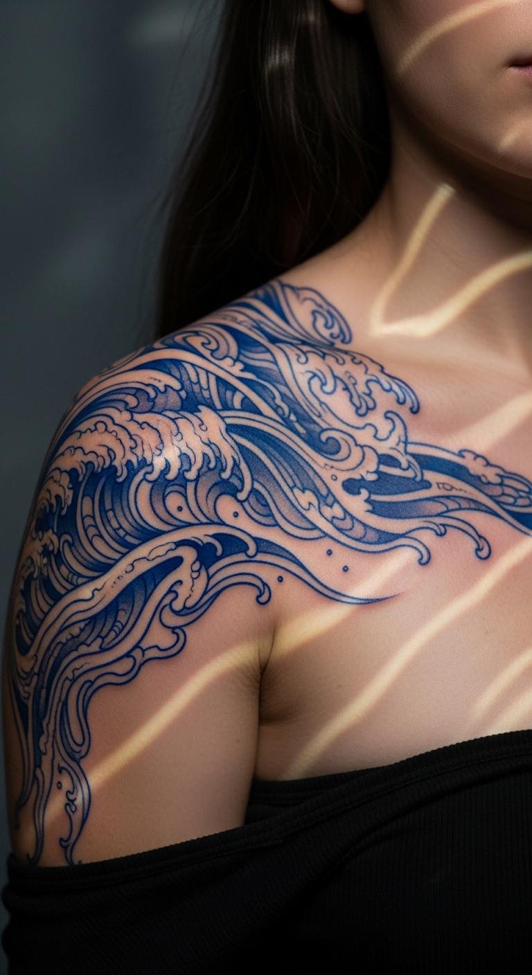 Waves of the ocean on your shoulder mean adventure and peace. Many women go for the flow. A mini version at $65. Try wave art at home. Look for water-themed deals. Wave design moves with you. Draw ocean scenes first. Curve it naturally. Care with water-based products. Dive into this idea.