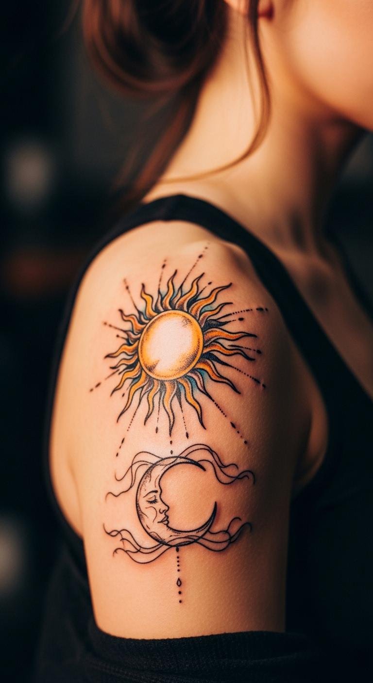 Sun and moon on your shoulder represent balance and cycles. Women select them for harmony. Pair them simply for $75. Use solar stickers to preview. Find celestial packages. Contrast design plays with light. Plan with day-night sketches. Spot it for dual visibility. Easy healing tips apply. Balance your look.