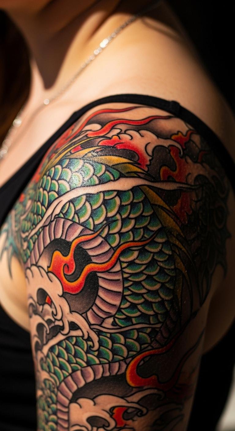 Imagine a dragon wrapping around your shoulder. It shows raw energy and protection. Women often pick this for its bold edge. Opt for a smaller size to cut costs—around $80. Practice with sticker tattoos first. Search for studios with package rates. Bold tribal elements make it stand out. Draw rough versions at home to visualize. Place it where it flows onto your arm. Healing takes care with simple bandages. Show it during casual outings. This design empowers you in minutes of ink time.