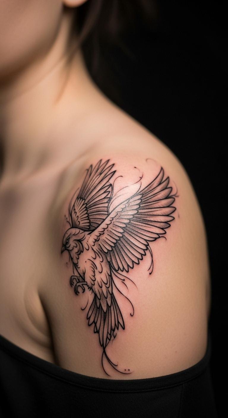 A bird taking off on your shoulder means freedom and aspiration. Women go for the lift. A single bird at $55. Test with bird cutouts. Find flight deals. Bird design soars high. Sketch flights of fancy. Let it take wing. Simple healing works. Fly free.