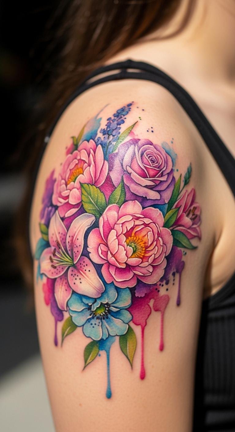 See colorful flowers in watercolor style on your shoulder. They represent growth and joy. Women love the artistic vibe. Choose two or three blooms for under $100. Test with washable markers first. Look for online deals from local artists. Watercolor tattoo gives a painted look. Sketch simple flowers yourself for practice. Place them near the collarbone for flair. Healing needs only moisturizer. Flaunt it in summer dresses for fun.