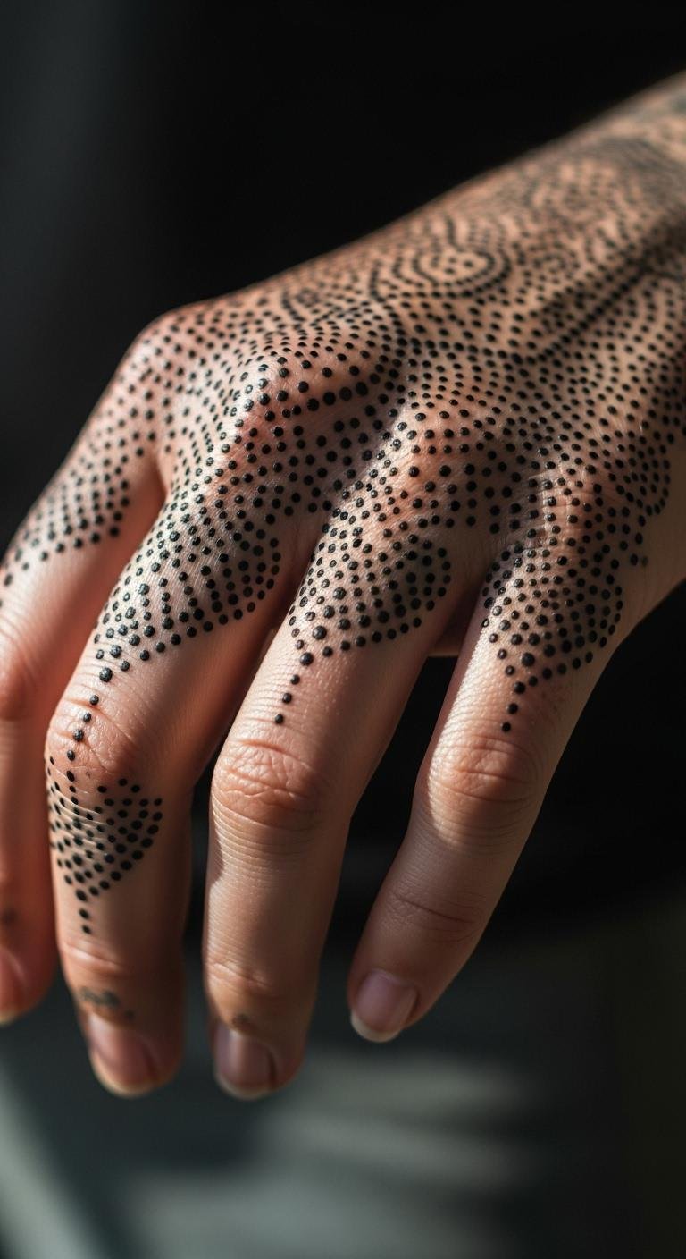 Dotwork creates texture on hands. Dot paper to begin. Simple method. Put it on your hand for interest. This design stands out. Use a marker for dots at home. No expense. Patterns cost $50. Opt for clusters. Try dot stickers first.