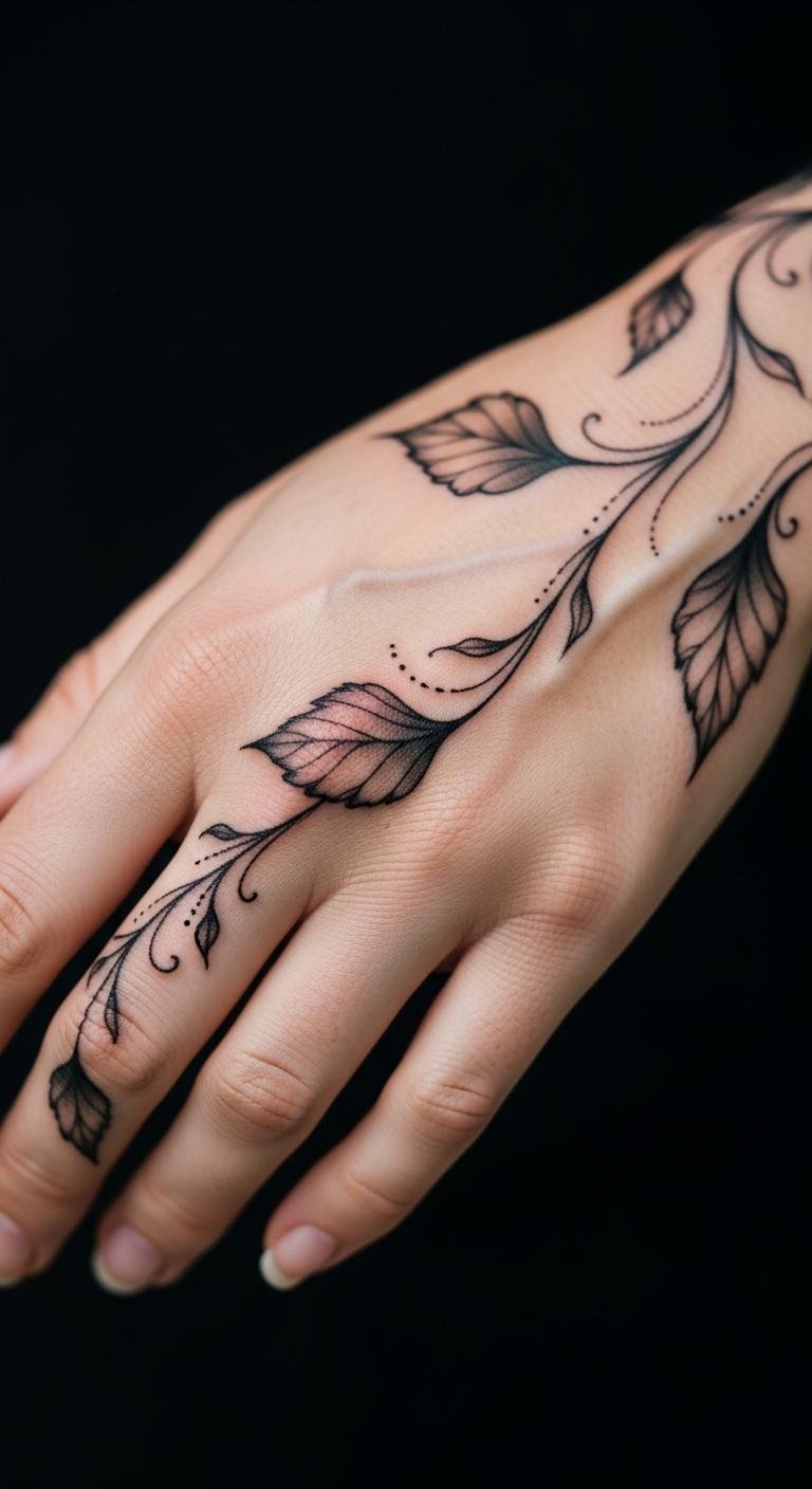 Leaves and vines connect to nature. Sketch leaves on paper. Simple step. Place them on your hand for green vibes. This design feels organic. Use real leaves for traces. No cost. Designs are $45. Choose vines. Practice with stamps.