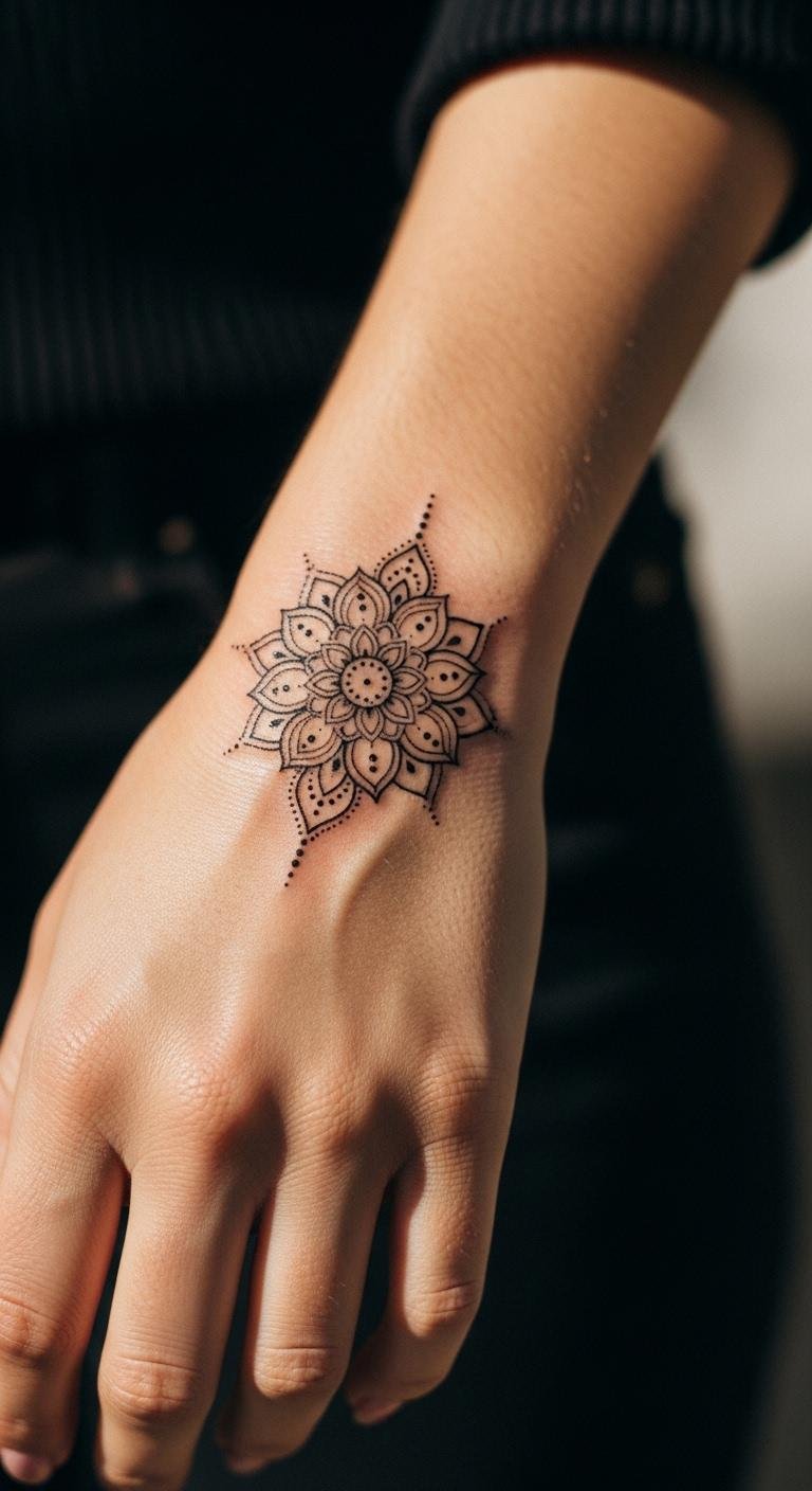 Mandalas offer a calming pattern for your hand. Draw a simple circle with lines on paper first. It’s straightforward and free. Position it on your palm for a hidden spot. These designs promote harmony and style. Use string and a pen for a DIY template at home. This keeps costs low. A mandala tattoo runs around $70. Choose basic shapes to avoid complexity. Try it with washable markers before committing. They help you see how it flows. Keep the design symmetrical for appeal. This style fits quiet moments and adds depth.