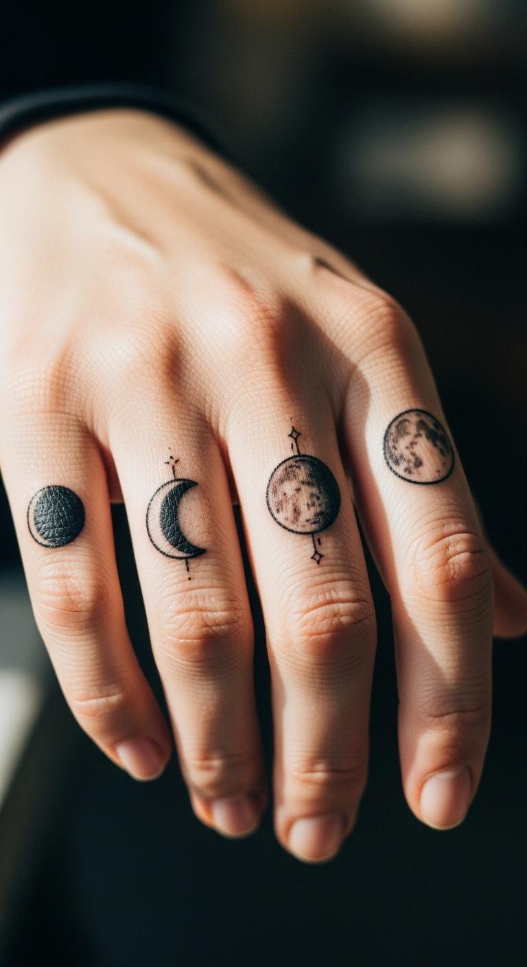Moon phases add a mysterious vibe. Sketch phases on paper first. It’s easy. Line them on your fingers for a story. This design feels magical and personal. Use coins to trace circles at home. No extra cost. A set might be $60. Choose black ink for clarity. Test with temporary designs online for under $10. Keep the flow natural.