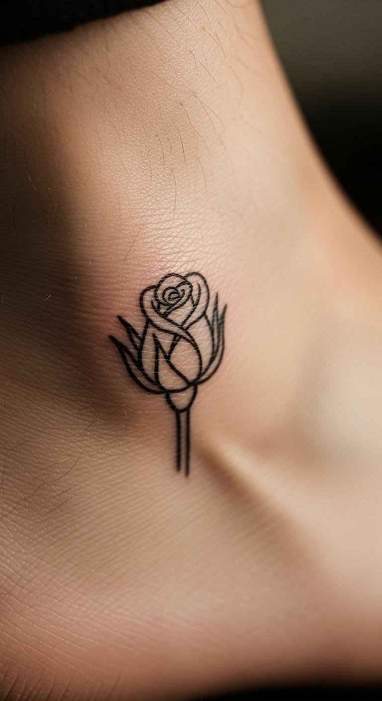 A rose bud outline adds a classic bloom to your ankle. Think of soft petals in a basic form. This design exudes elegance and ease. Trace it with a pen on your leg first. Use washable stamps for a budget test—under $2. Look up artists on free apps and compare rates. Make it yours by varying the size. Apply simple cream from your drawer. Suits any occasion. Pick this for timeless beauty.