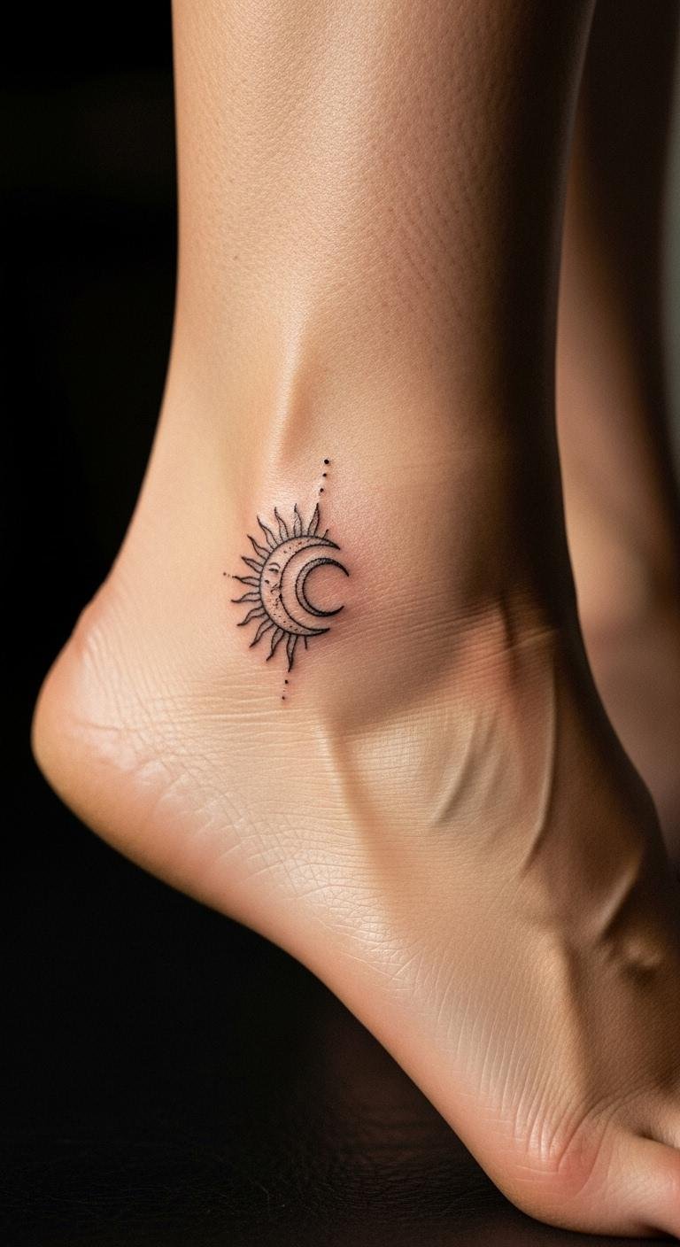 A sun and moon combo balances light and dark on your ankle. Envision two simple symbols side by side. This design speaks of harmony. Draw it free online. Try budget stickers. Find sales at studios. Make it unique with patterns. Heal with everyday items. Suits all moods. Pick this for balance.