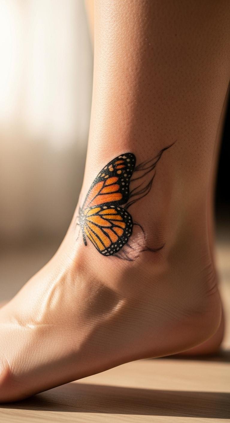 Butterflies on the ankle show change in a gentle way. Go for a small outline that fits your style. Draw a quick sketch with a pen on your skin to test it out. Save money by picking basic black ink over fancy shades. Artists often offer deals for first tattoos, around $60. Add details like tiny spots for uniqueness. Place it where clothes can hide it if needed. Simple step: Use a mirror to check angles at home. This design celebrates growth without much pain. Protect it with daily lotion from your cabinet. Act now: Grab paper and draw your version tonight.