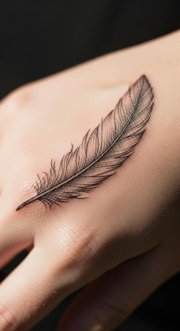 A feather on the hand means freedom. Go for light lines. Draw feathers free. Around $60. Personalize tips. Visible choice. Home trials. This evokes spirit. Use creams. Start sketching.
