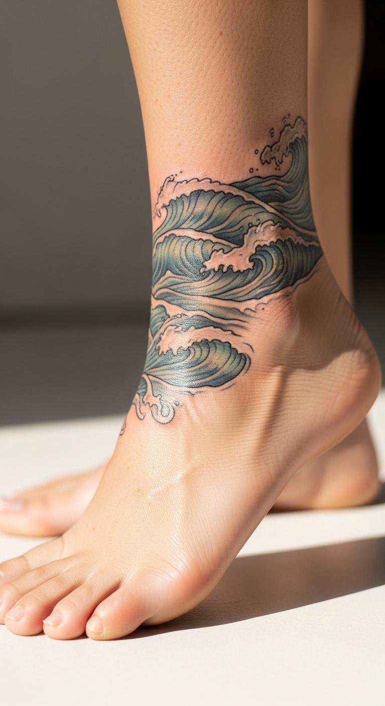 Waves on the foot suggest journeys. Choose patterns. Sketch on paper. Cost $50. Add elements. Cover with socks. Test ideas. This design inspires. Basic upkeep. Draw today.