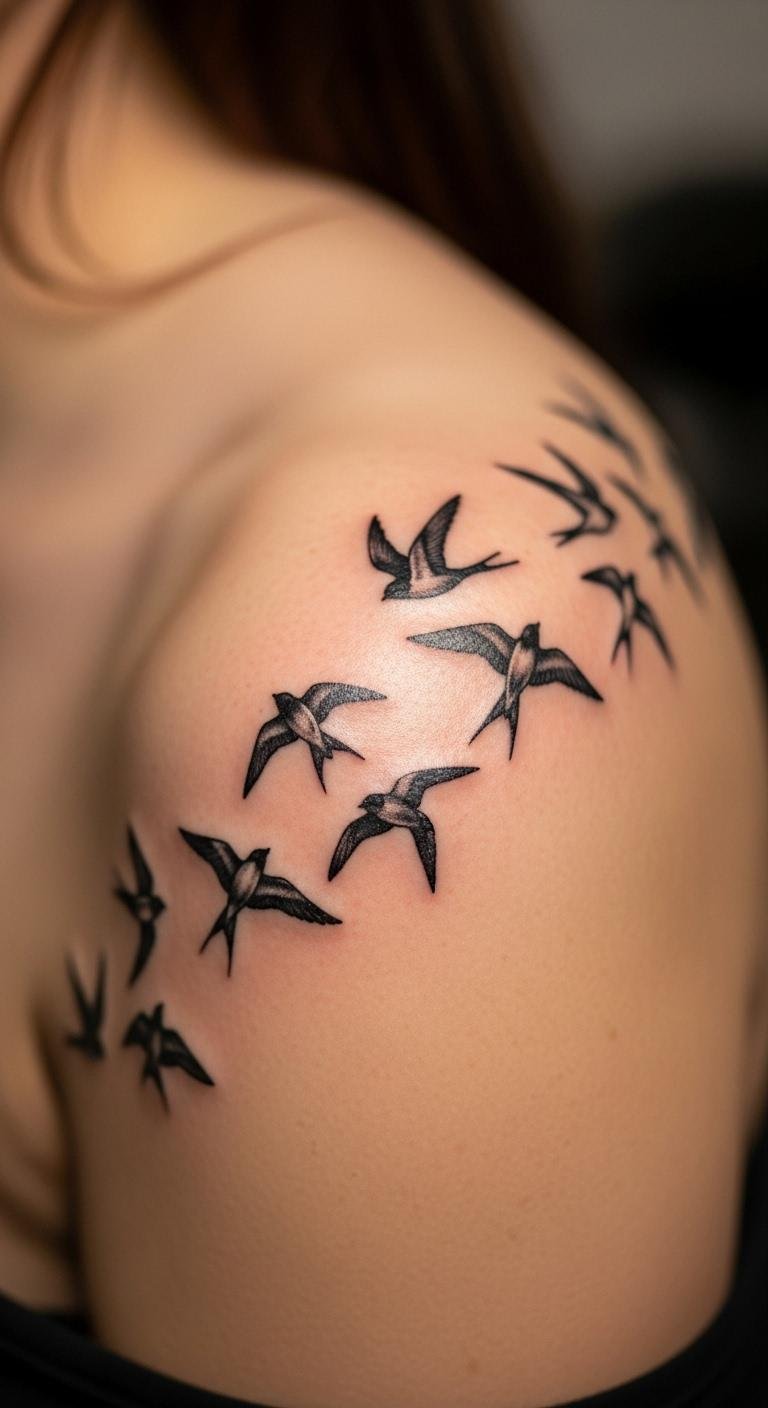 Bird on the shoulder means adventure. Pick flying pose. Doodle birds. Around $70. Add details. Visible choice. Test first. This evokes freedom. Sunscreen use. Draw now.