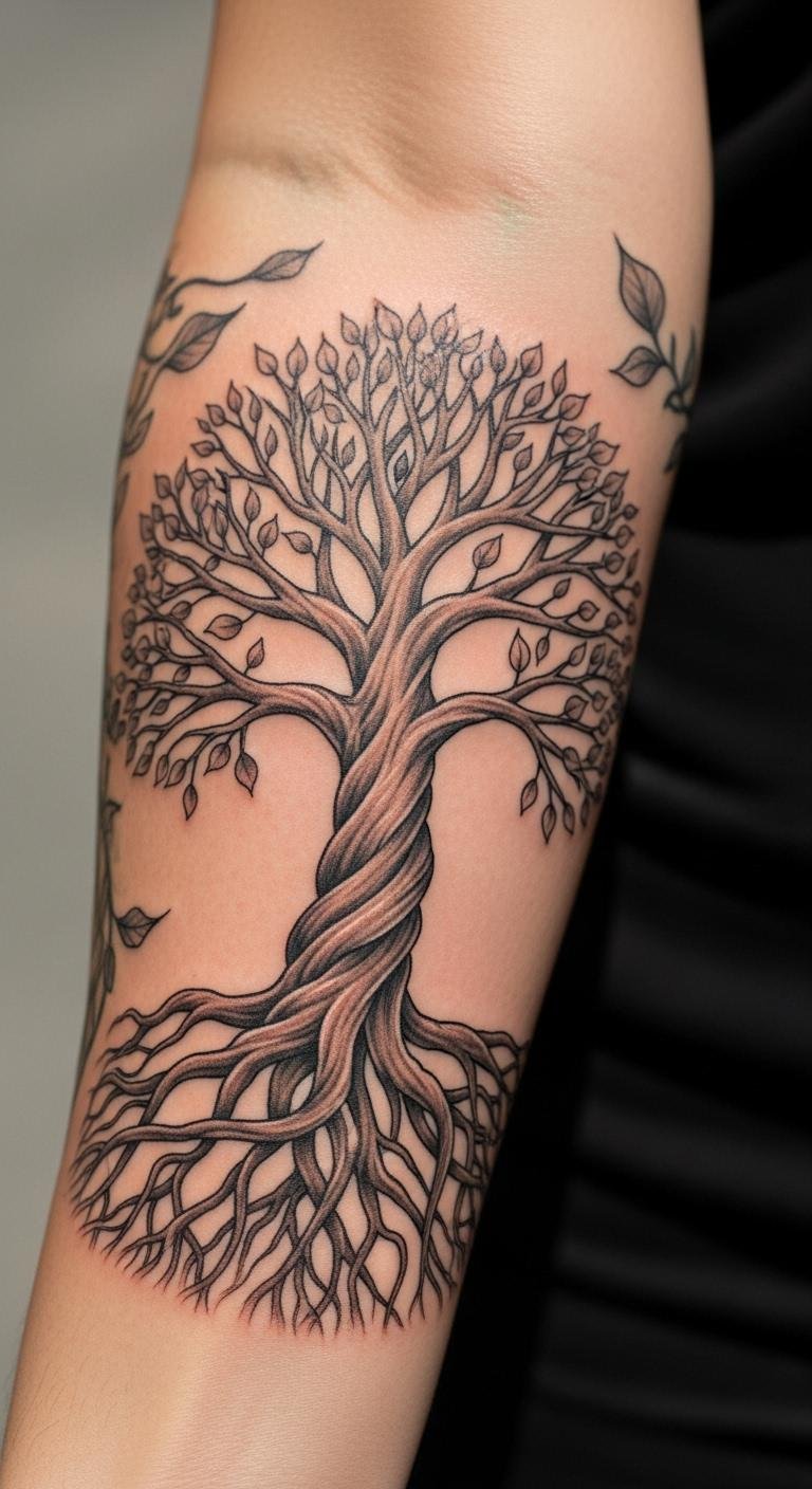 Tree on the forearm symbolizes roots. Choose basic tree. Sketch trees. Cost $60. Personalize leaves. Daily view. Home practice. This means stability. Care with creams. Act today.
