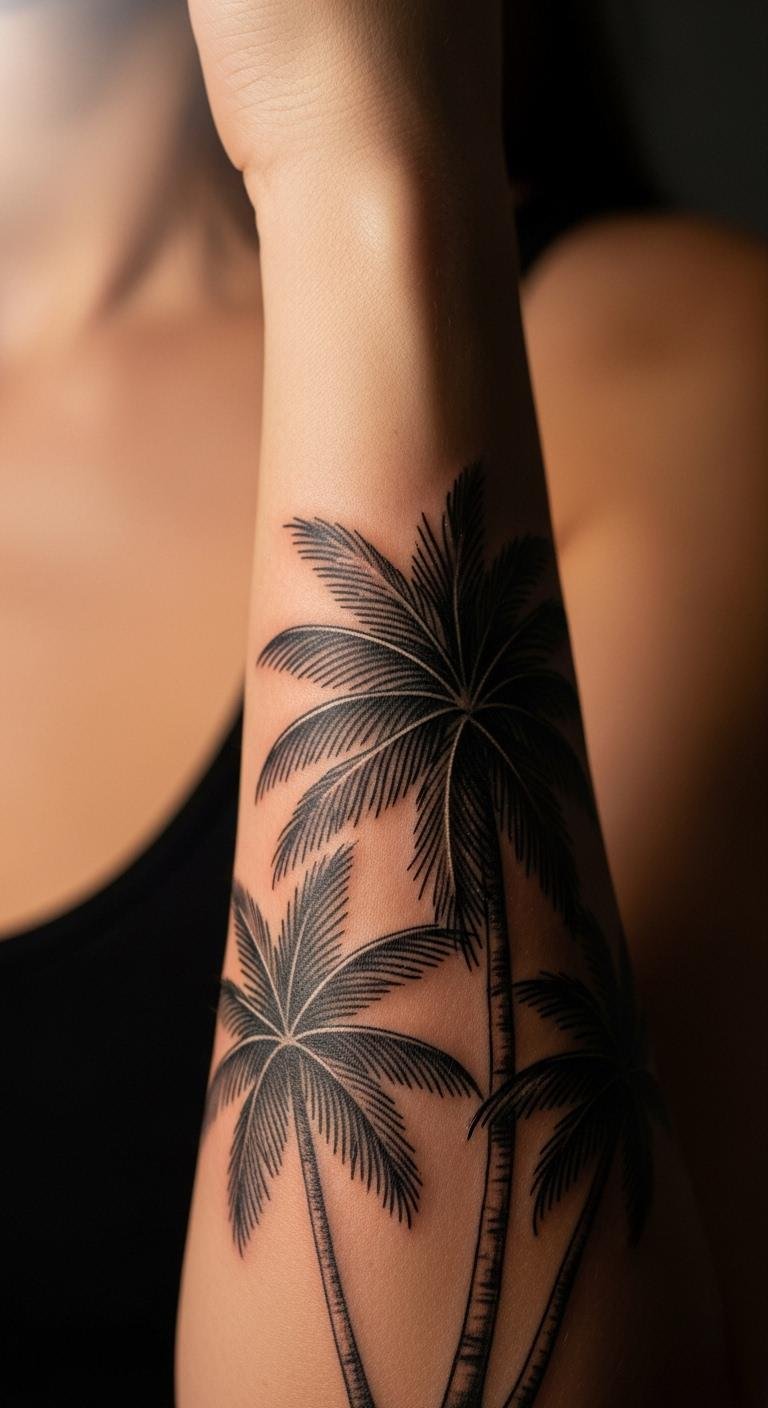 A palm tree on your arm suggests relaxation. Go for basic fronds. Sketch trees free. Cost around $50. Add a trunk twist. Place for views. Try with paper. This design evokes calm. Use your lotion. Draw it today.