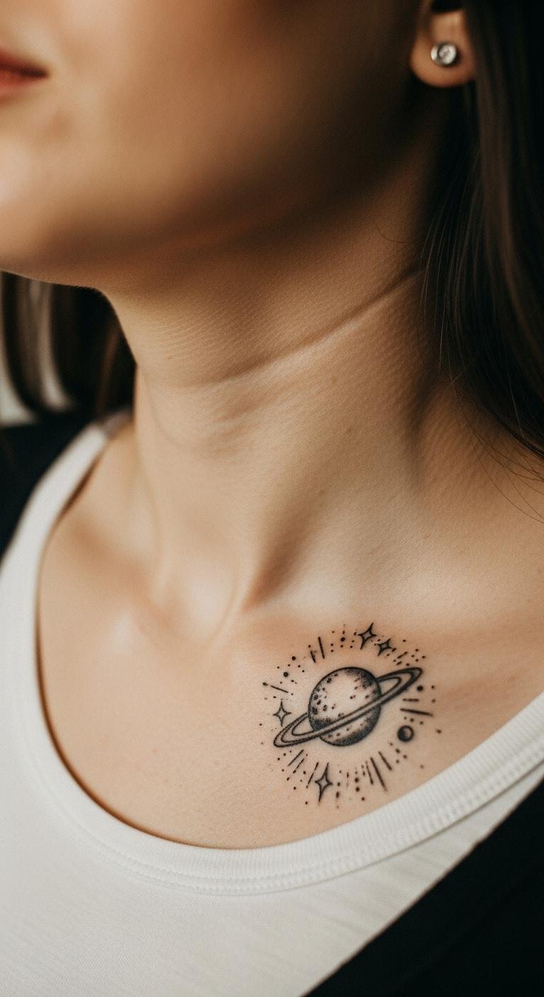 Saturn near your collarbone means mystery and dreams. Pick a ringed circle design. Use phone apps to doodle it for free. Budget find: Local shops might offer it for under $60. Customize with tiny stars around it. Hide it under clothes if you want. Simple try: Tape a paper cutout on your skin first. This tattoo inspires exploration. Clean with regular wipes. Do this: Draw it quick and plan your spot.