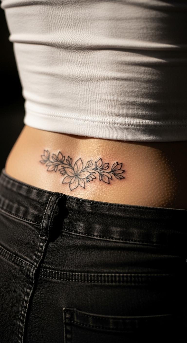 Flowers on the lower back feel empowering now. Go for a vine of blooms. Sketch patterns on paper for free. Find deals at $70 for this size. Add twists like intertwined leaves. Cover it with clothes as needed. Home idea: Draw on with washable ink first. This design shows strength. Care with basic lotions. Act: Plan your pattern tonight.