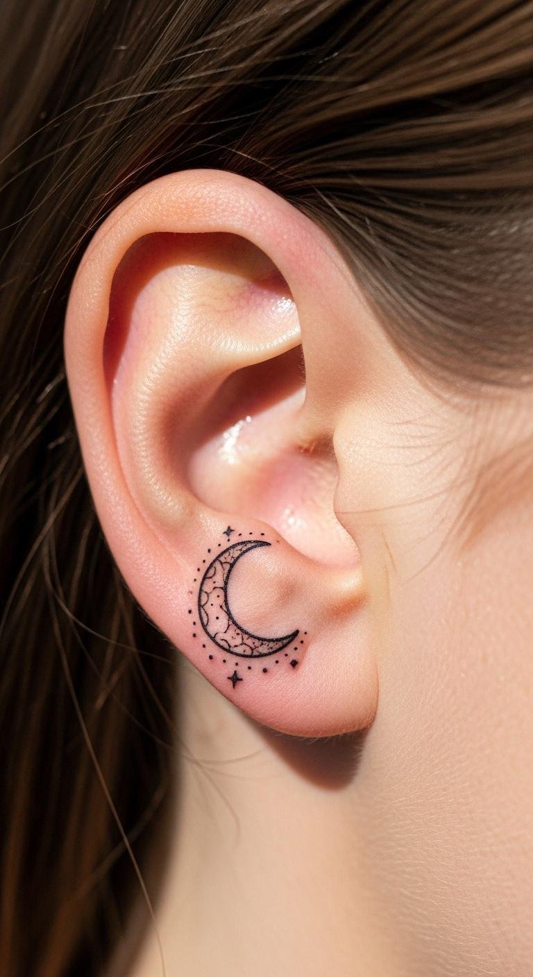 A moon behind your ear offers subtle guidance. Choose a crescent shape. Doodle it on your ear with a mirror and pen. Save by opting for quick sessions at $50. Personalize with phases. Keep it hidden under hair. Try: Stick a temporary one on. This tattoo means protection. Use daily creams. Do it: Sketch and decide.