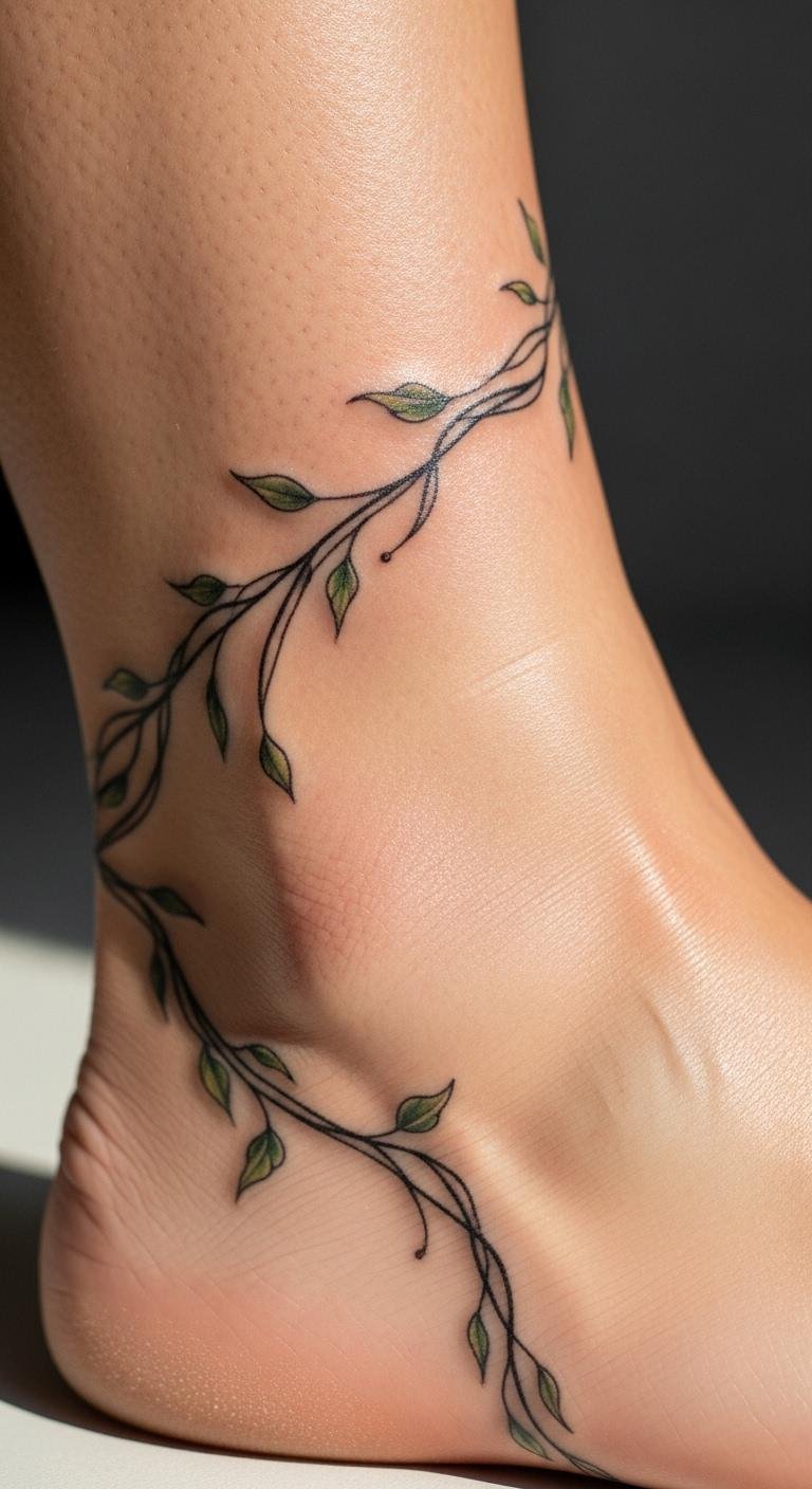 Vines on the ankle symbolize progress. Pick a winding line. Draw vines on paper using free guides. Budget: Look for $60 options. Add small buds. Show or hide with shoes. Home test: Use markers. This design represents beauty. Moisturize regularly. Start drawing now.