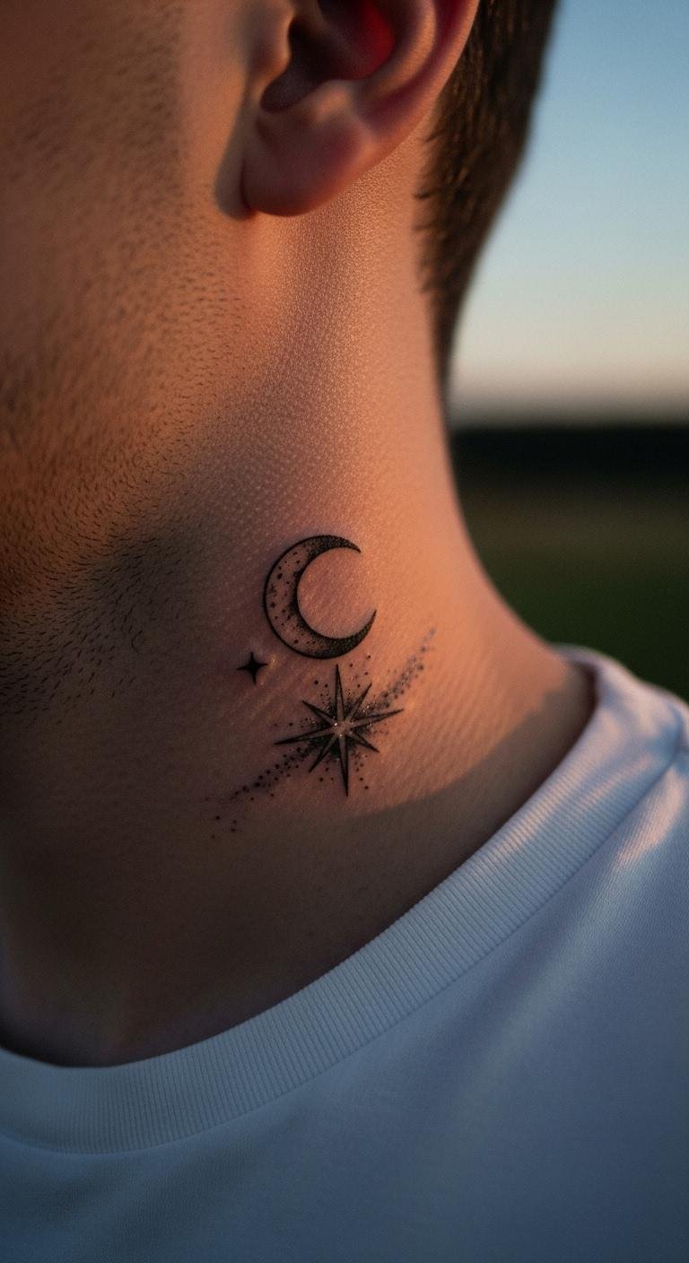 Star and moon motifs inspire dreams. Place them on your neck for wonder. They symbolize guidance. Costs $70. Sketch constellations. Use night themes. Star and moon tattoos shine with care. Check for set pricing. Add planets for fun. Get it evenings.
