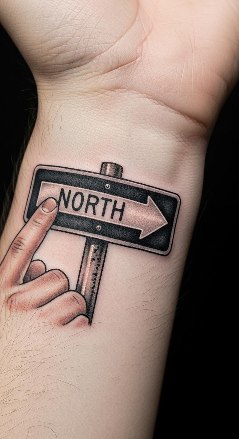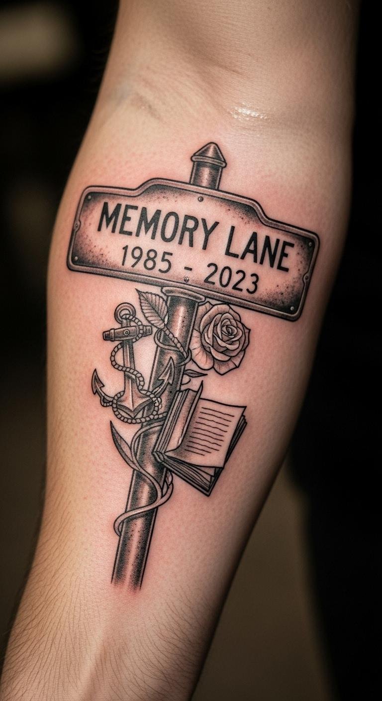 Make it yours by adding icons. Pair a sign with a bench or arrow. Draw on scrap paper first. Download free templates online. Aim for a $100 tattoo job. Blend in meaningful items like your favorite spot. Easy actions: list your icons. Arrange them simply. Use basic black for clarity. This design tells your story. Try a DIY sticker version at home with markers. It’s fun and low-cost.