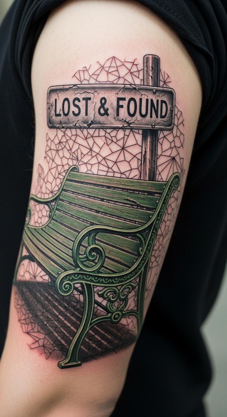Mix benches with signs. Draw the combo. Use free drawing apps. Tattoo for $130. Link them well. Steps: sketch bench. Add sign. Use outlines. This creates scenes. Build with household items. Low budget.
