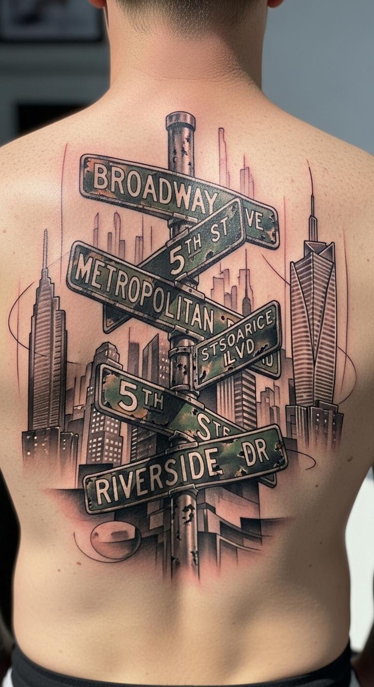 Blend signs with city scenes. Add benches or skylines. Plan on paper. Free photo editors aid. Tattoo for $170. Arrange elements. Actions: list scenes. Combine simply. Use basic colors. This builds stories. Draw a mock-up at home. Easy and cheap.