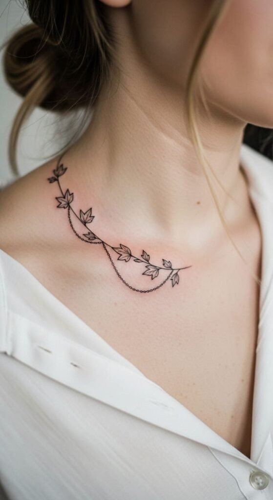 Dainty leaf chains mimic nature’s grace on your collarbone. Envision a row of small leaves that flow with your body. This idea feels earthy and calm. Draw leaves on a notebook with markers you already own. Use free phone apps to arrange patterns before committing. Studios offer this for around $70, keeping it budget-friendly. Add a berry for a unique story. Healing works best with breathable fabrics. Practice by taping leaf cutouts to your skin. Bold the key: rehearse at home. It’s a simple step to ensure it looks right.