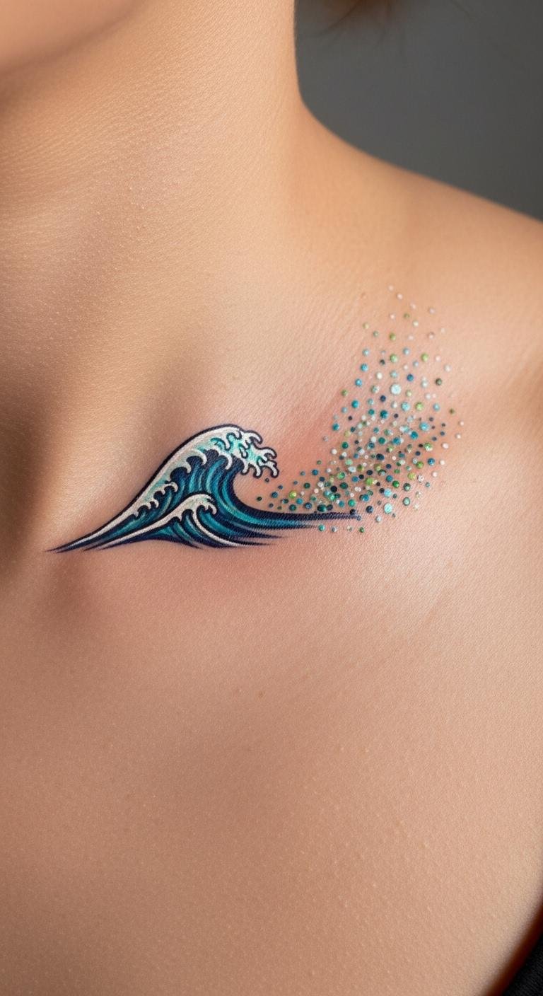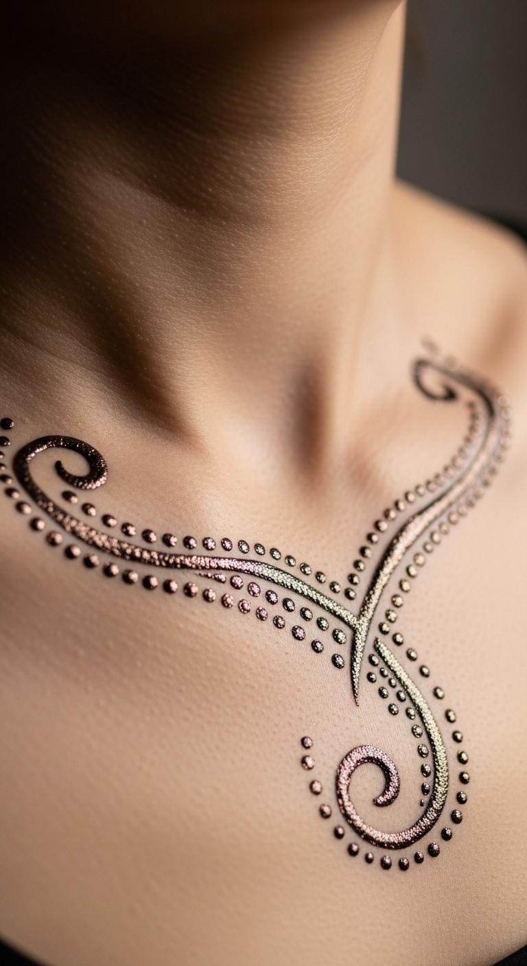 Waves and dots combine flow on your collarbone. Picture a curve with spots. This feels dynamic. Draw waves and dots. Use string and beads. Costs $55. Customize the placement. Aftercare is simple. Test with setups. Bold the key: mix elements. It keeps costs low.