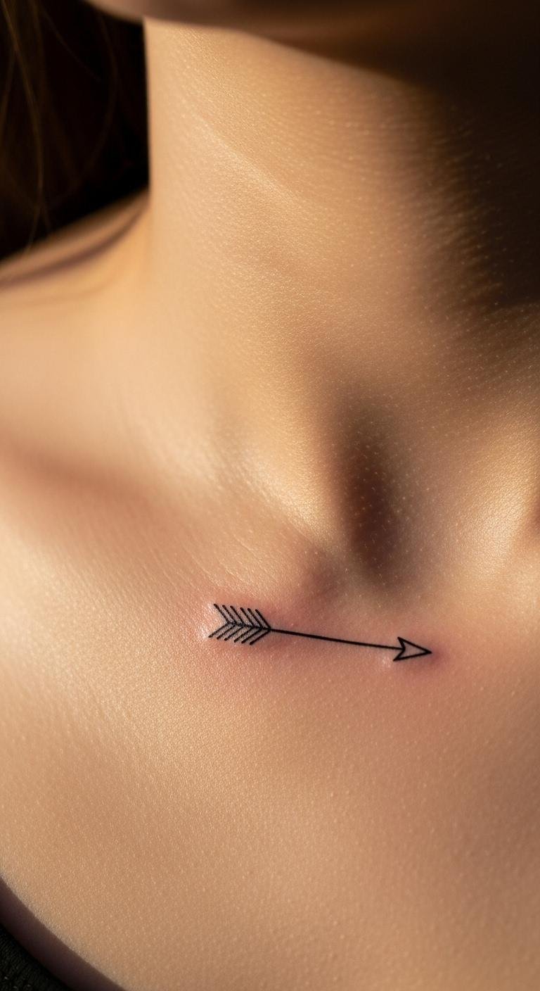 A minimalist arrow point directs attention to your collarbone. Imagine a small straight line with a tip. This symbol stands for direction or growth. Sketch arrows on paper quickly. Test placement with tape and a drawn line. Sessions cost as little as $50. Add a feather for extra flair. After healing, it pairs with any outfit. Try drawing with a borrowed pen first. Bold the key: start with sketches. It’s an affordable way to visualize.