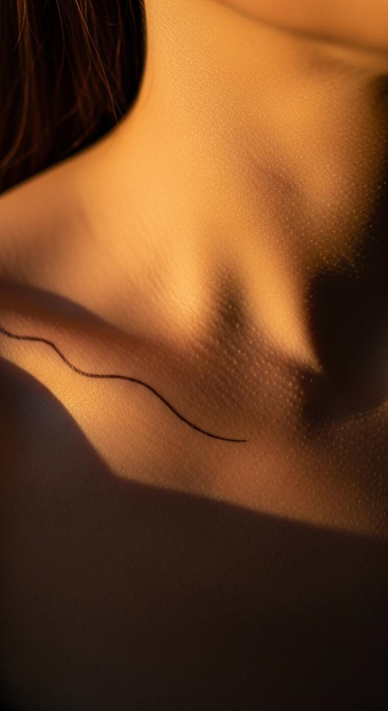 A simple wave line adds motion to your collarbone. Picture one flowing curve. This design stays sleek and easy. Draw waves on notebook paper. Use string to mimic on your body. Costs are low at $40. Vary the wave for fun. Healing requires minimal effort. Test with ribbon ties. Bold the key: imitate with objects. It simplifies the process.