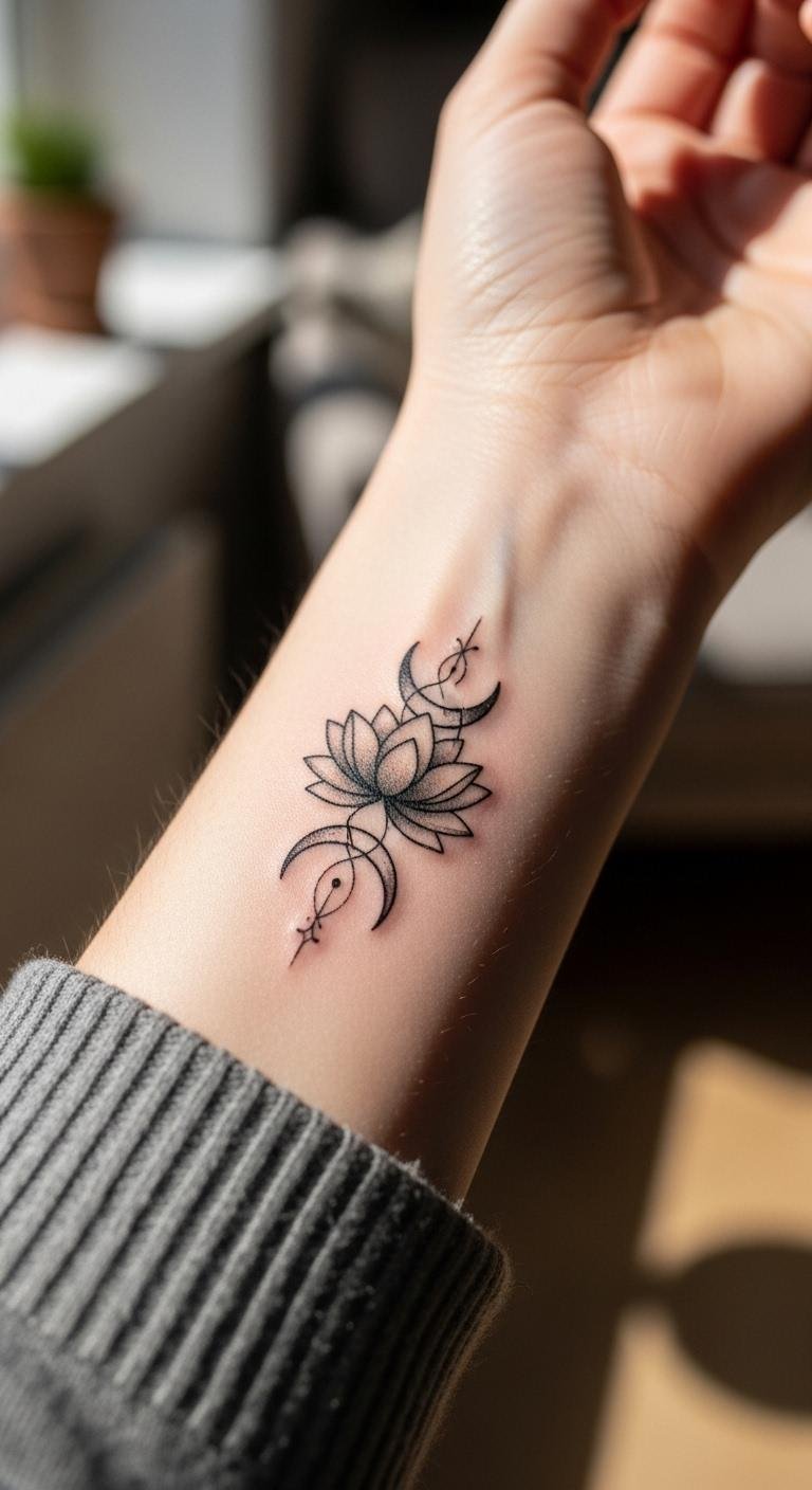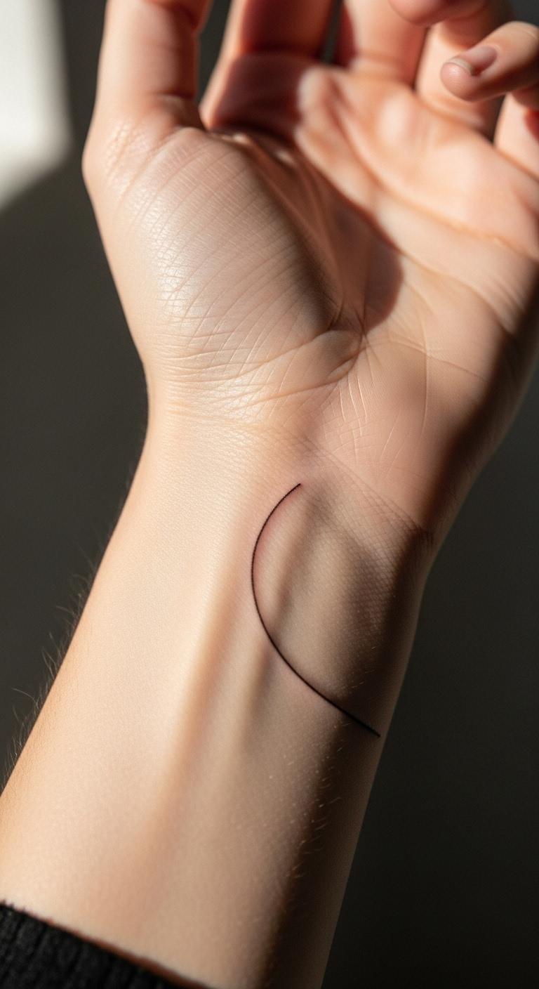 Delicate minimalist lines make a great start for tiny wrist tattoos. These designs use just a single stroke to create something elegant. You get a clean look that says a lot with little effort. Many women pick this for its timeless appeal.
