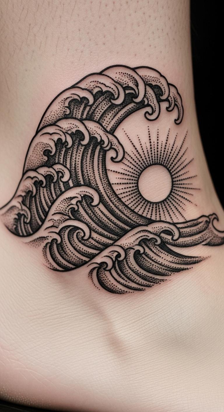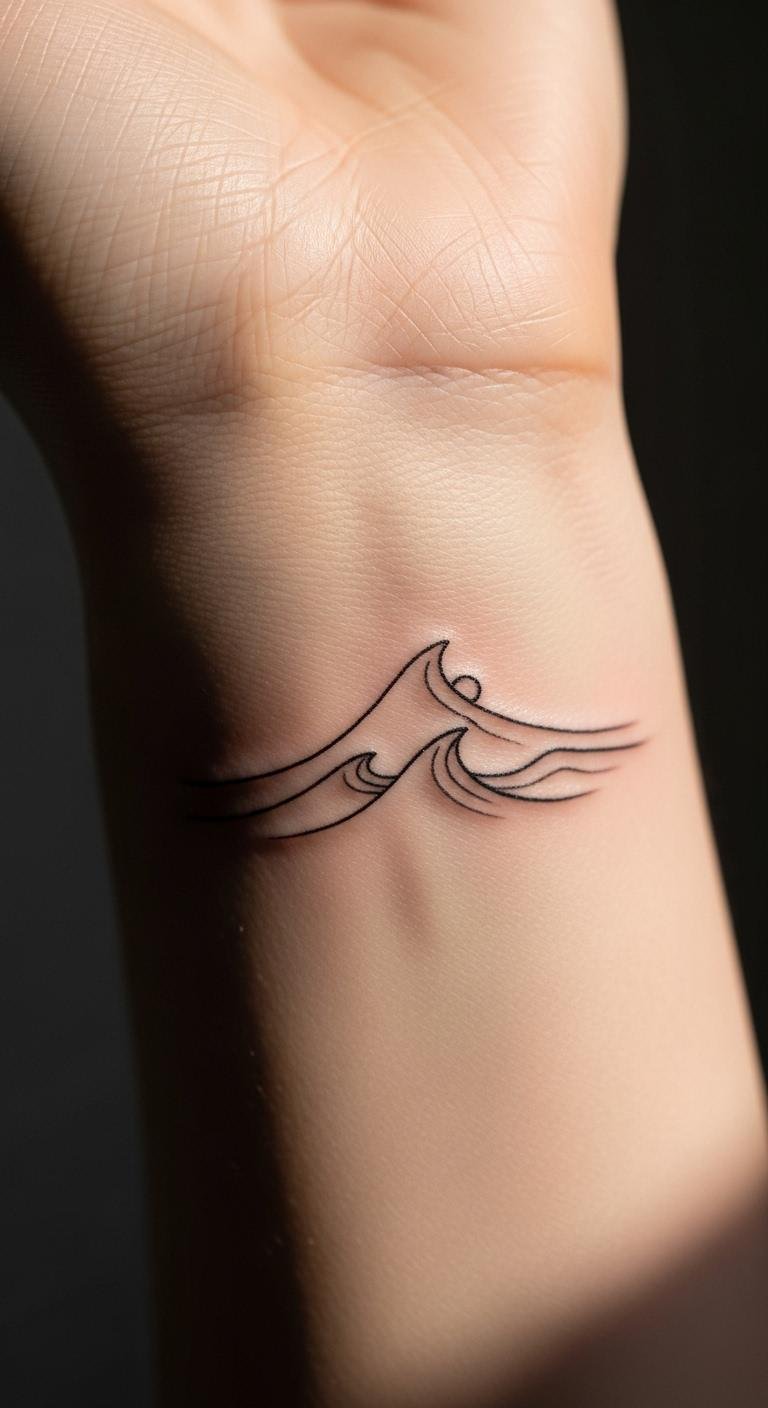 Think simple lines that flow like the sea. A fine line wave on your wrist offers clean elegance. Start with a basic sketch on paper. Use a pen to draw waves and add a sun circle. This DIY step helps you visualize fit. Pick a local artist who specializes in minimalism. They charge less than $100 for small work. Go for black ink to keep costs down. Placement here hides easily at work. Short sessions mean less pain. Add a personal twist, like a wave peak for a life event. This design suits daily wear and shows resilience. Try tracing your own design with washable markers first. It builds confidence. Real talk: healing takes two weeks, so cover with sunscreen. Pair it with ocean-themed jewelry for fun.