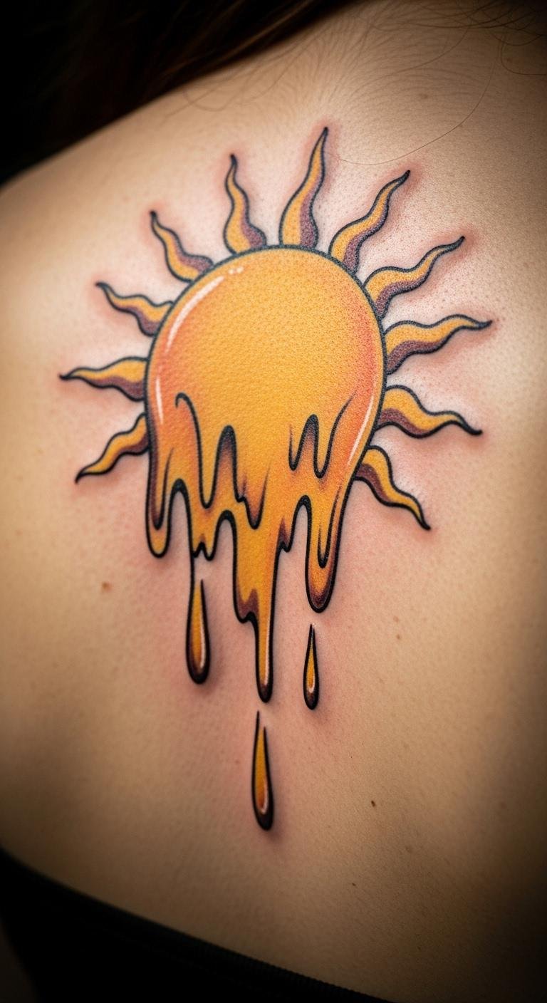 Picture a sun that drips like wax. This melting style on your back adds drama and change vibes. Grab colored pencils and draw melting shapes on paper. It sparks ideas fast. Find an artist online for under $200. Focus on surreal techniques they master. Use basic inks to save money. Back space lets details pop without crowding. Short breaks during the session ease discomfort. Make it yours with a wave edge for balance. This tattoo speaks to life’s shifts. Practice with temporary stickers before committing. They cost pennies and wash off easy. Healing? Keep the area dry for a week. Wear loose clothes to protect it.