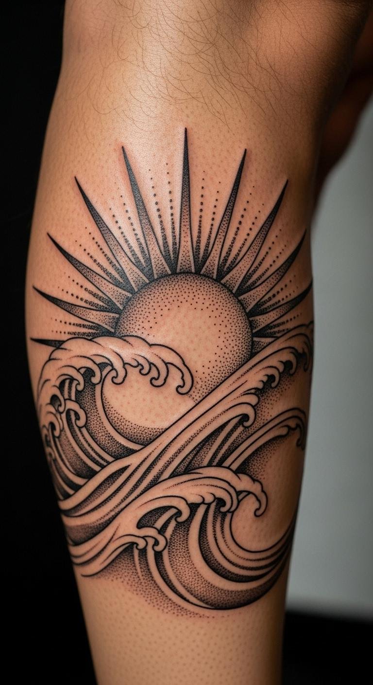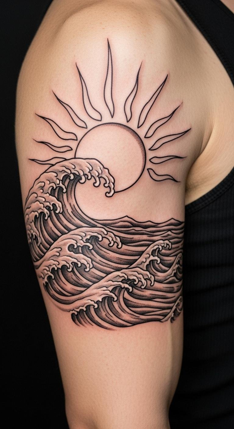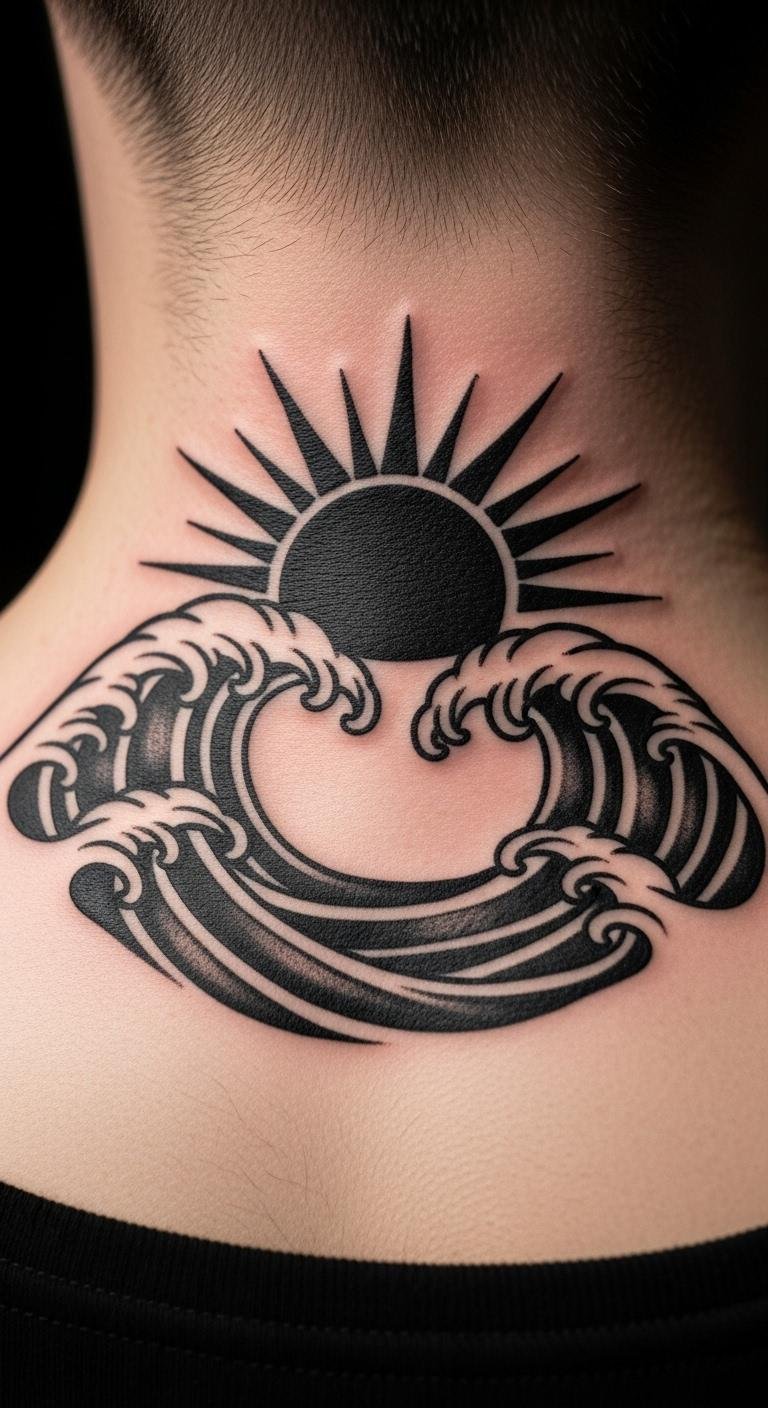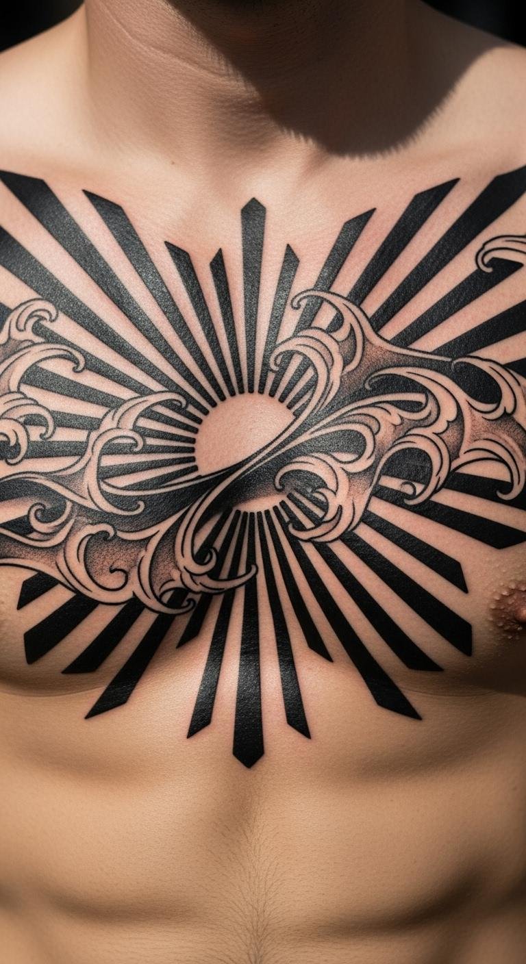 Bold black lines merge sun and sea. Chest placement amplifies the feel. Outline with a black marker on paper. Quick and helpful. Local ink for $160. Blackwork artists are key. All black ink keeps it budget-friendly. Chest design stands proud. Sessions split for comfort. Personalize with wave rays for memories. It stands for strength. Use temporary tattoos to preview; buy a pack for $10. Healing: use breathable fabrics. Rock it with open shirts.